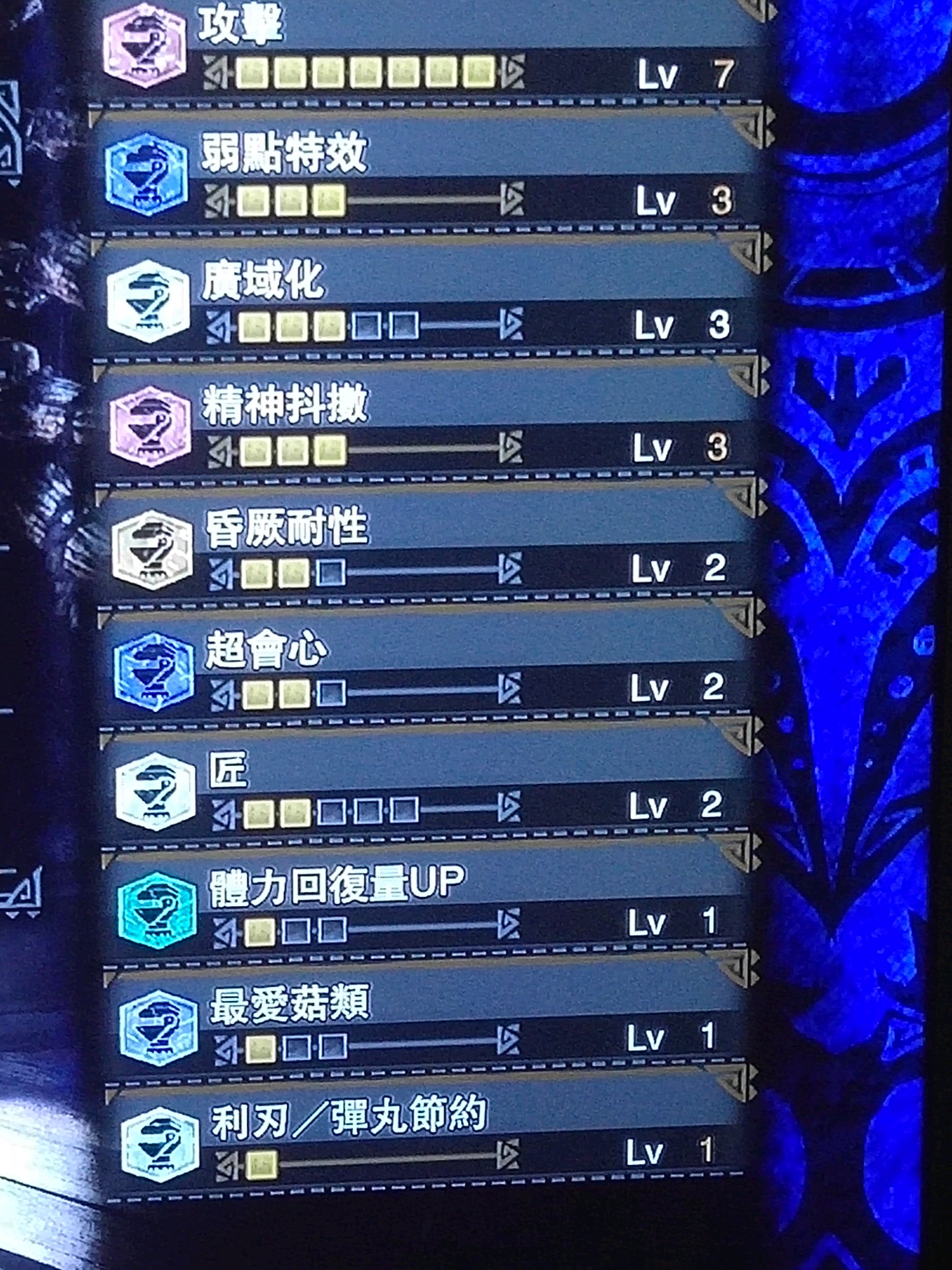 攻4 体力增强3 弱特3 匠3 精神抖擞2 昏厥耐性2 看破2 超会2 强化持续3 利刃 属性解放1