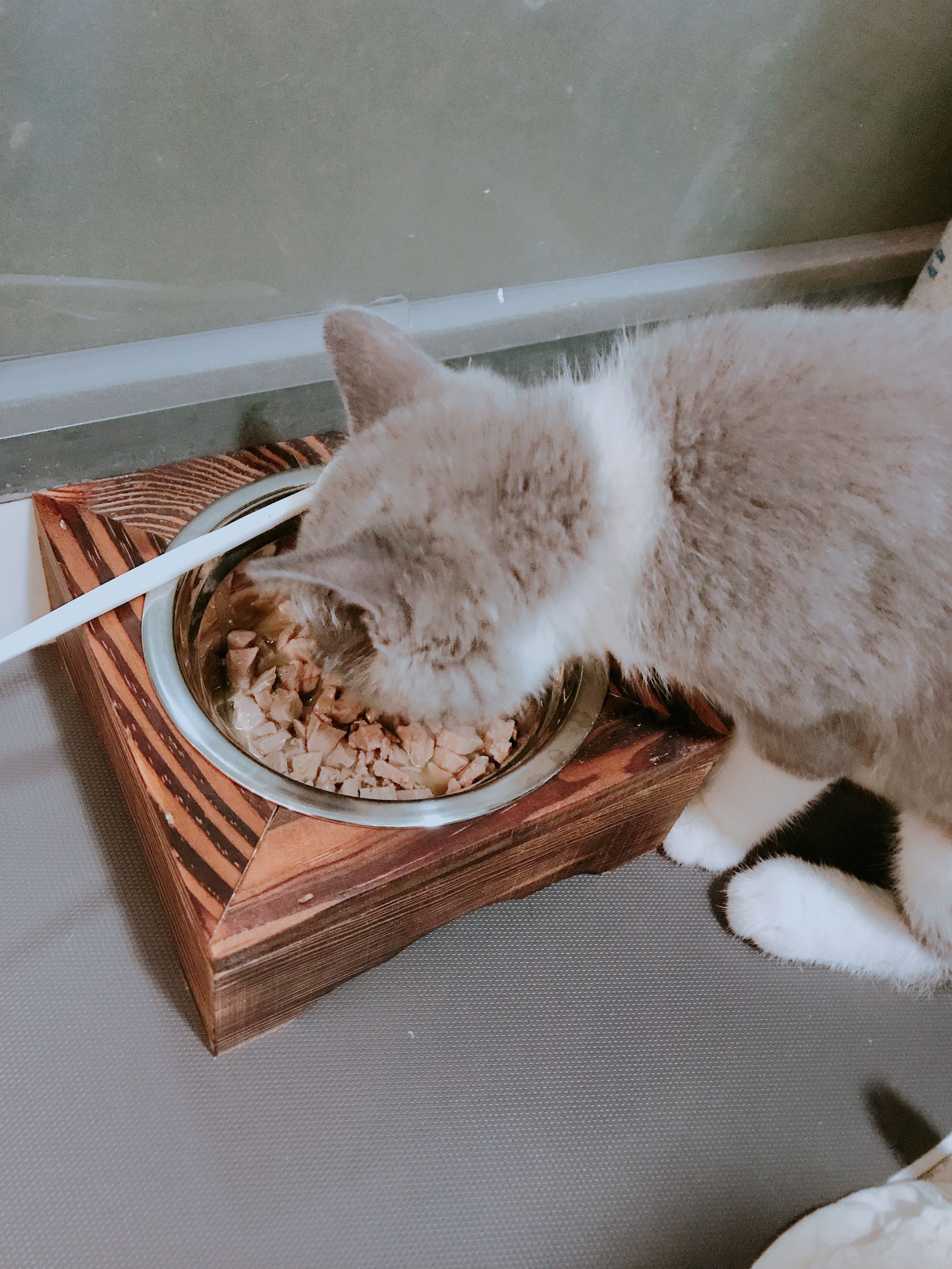 今天又分了四次 终于喂完了一个罐头 早上想着饿了一晚上给了50g就没吃完 看来他每次的饭量就在30-40g 一天热四次 洗四次碗 真是很麻烦了……