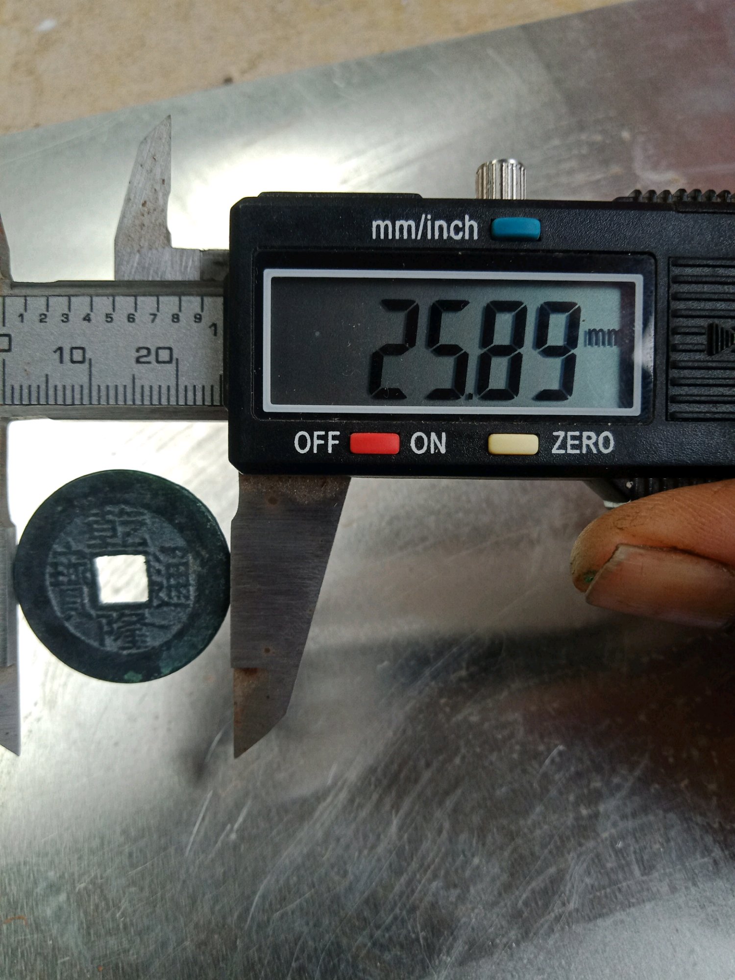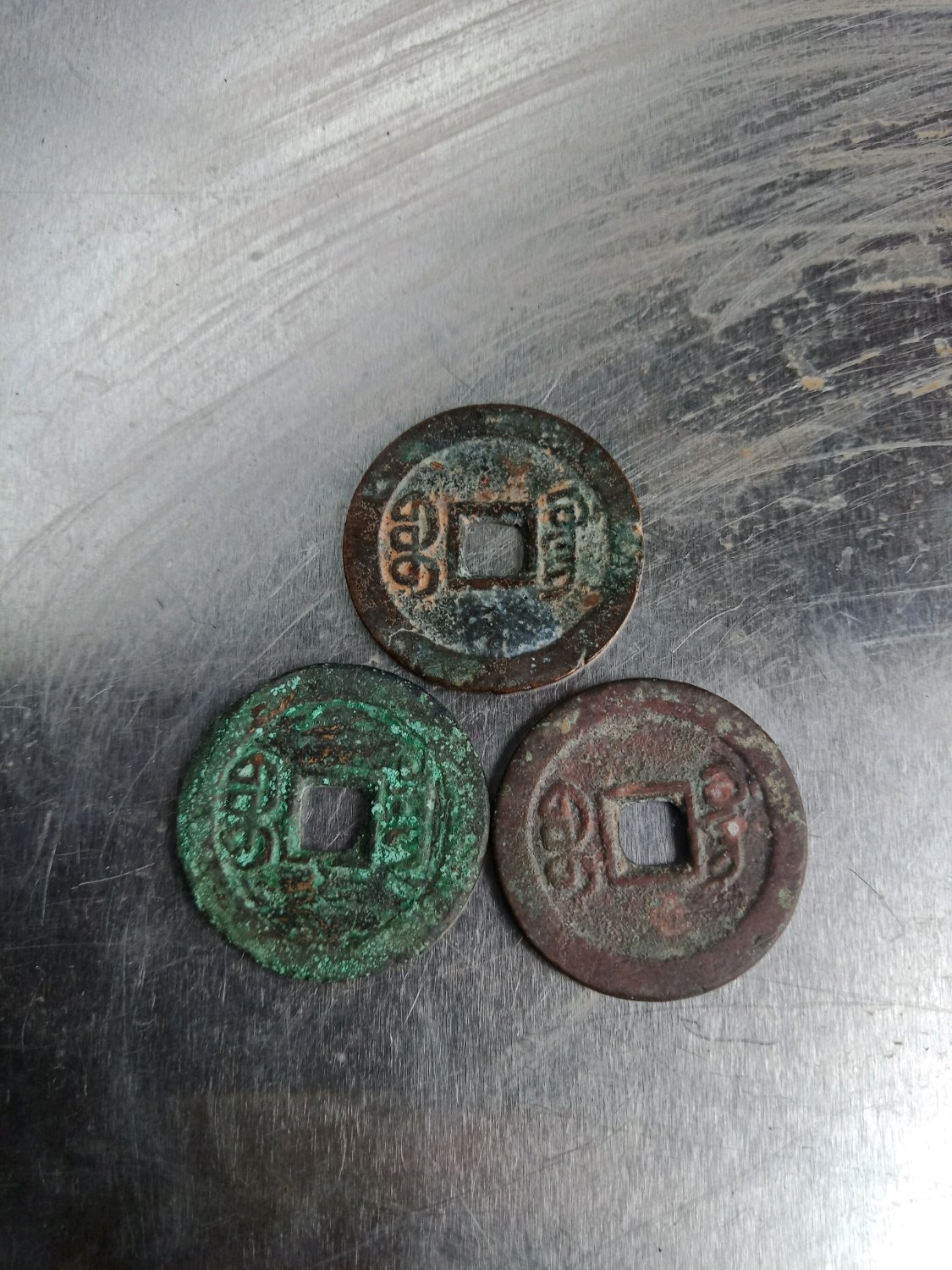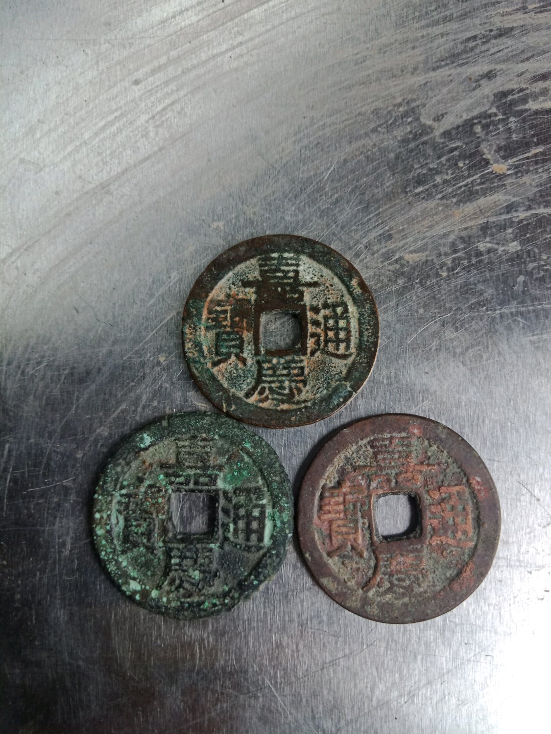 三枚大尺寸嘉庆。两枚到26一枚25.8。都是厚墩子,可惜啦品相自己随便一清理配五帝尺寸没问题。一起尔五