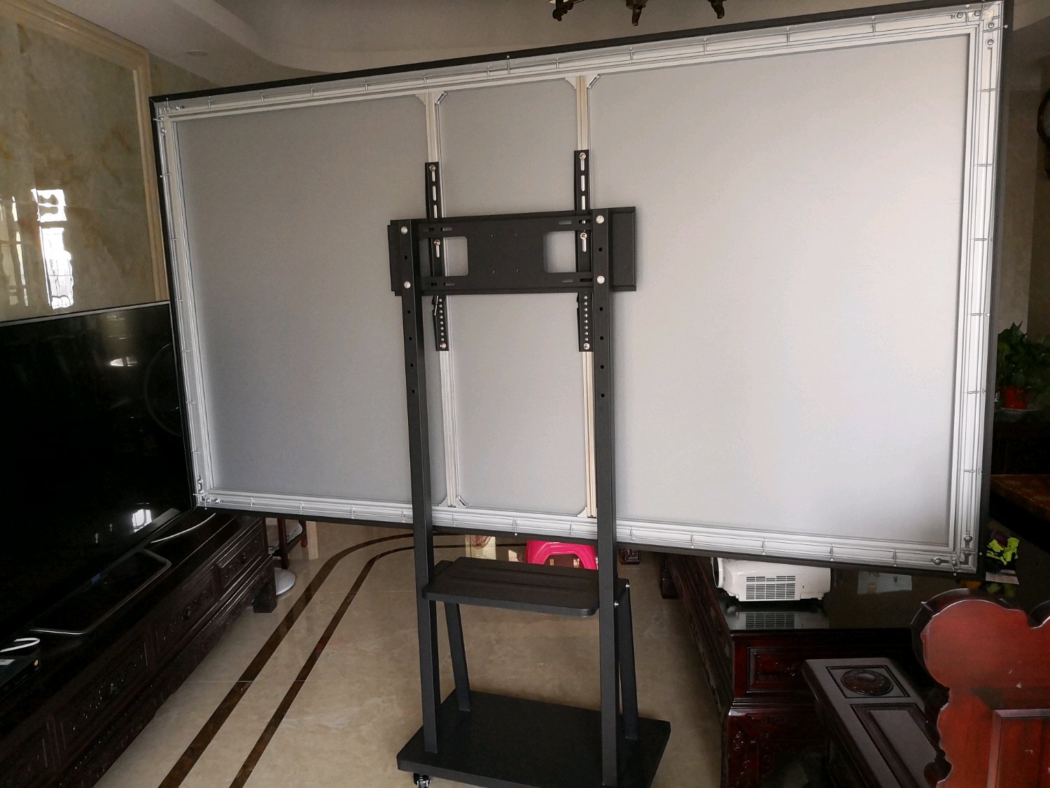 机器是爱普生tw5400,电脑城5200现货,蓝光机是华录N8s,幕布是益彩视抗光幕布100寸,电视支架288的淘宝货,幕布加了个电视支架,稍微要加点改装,完美移动100寸幕布