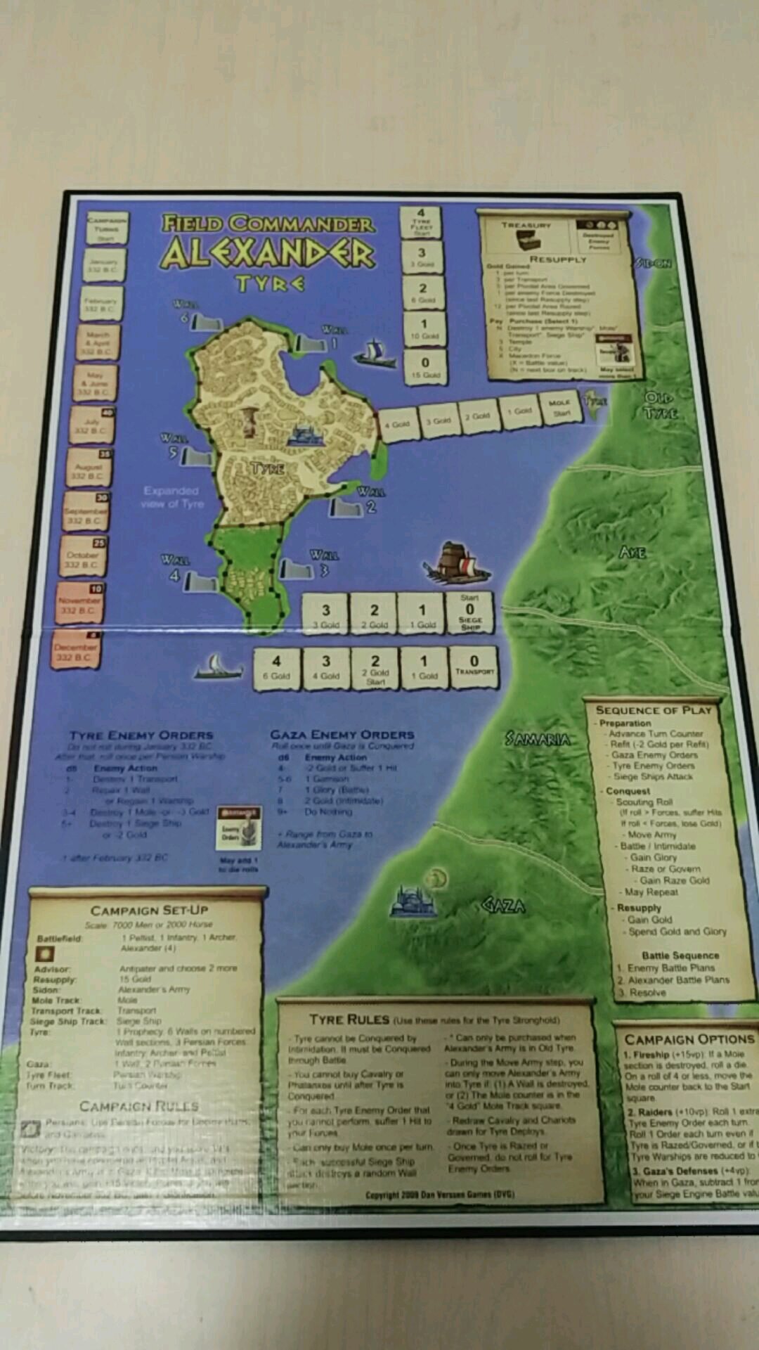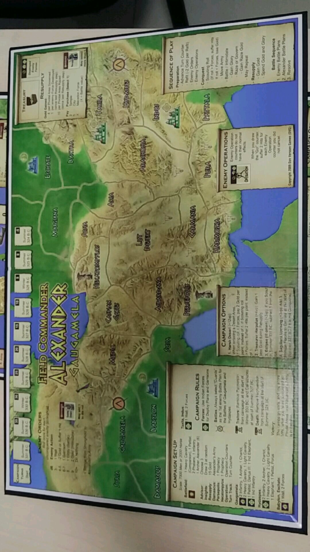 按照从公元前338年到324年的顺序有三张硬纸板地图,中间穿插了一个泰尔围城战地图,所以一共是四张。个人认为美工还是很不错的,虽然我自认并不是美工党!