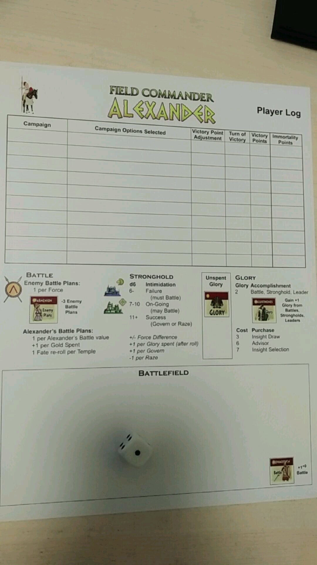 一张参考记录卡,上半部分可以记录战役可选规则,VP点调整、数值等情况。下半部分是用于摆放棋子进行战斗的区域,同时附有敌方战斗计划、要塞恐吓和荣誉获得的掷骰提示。