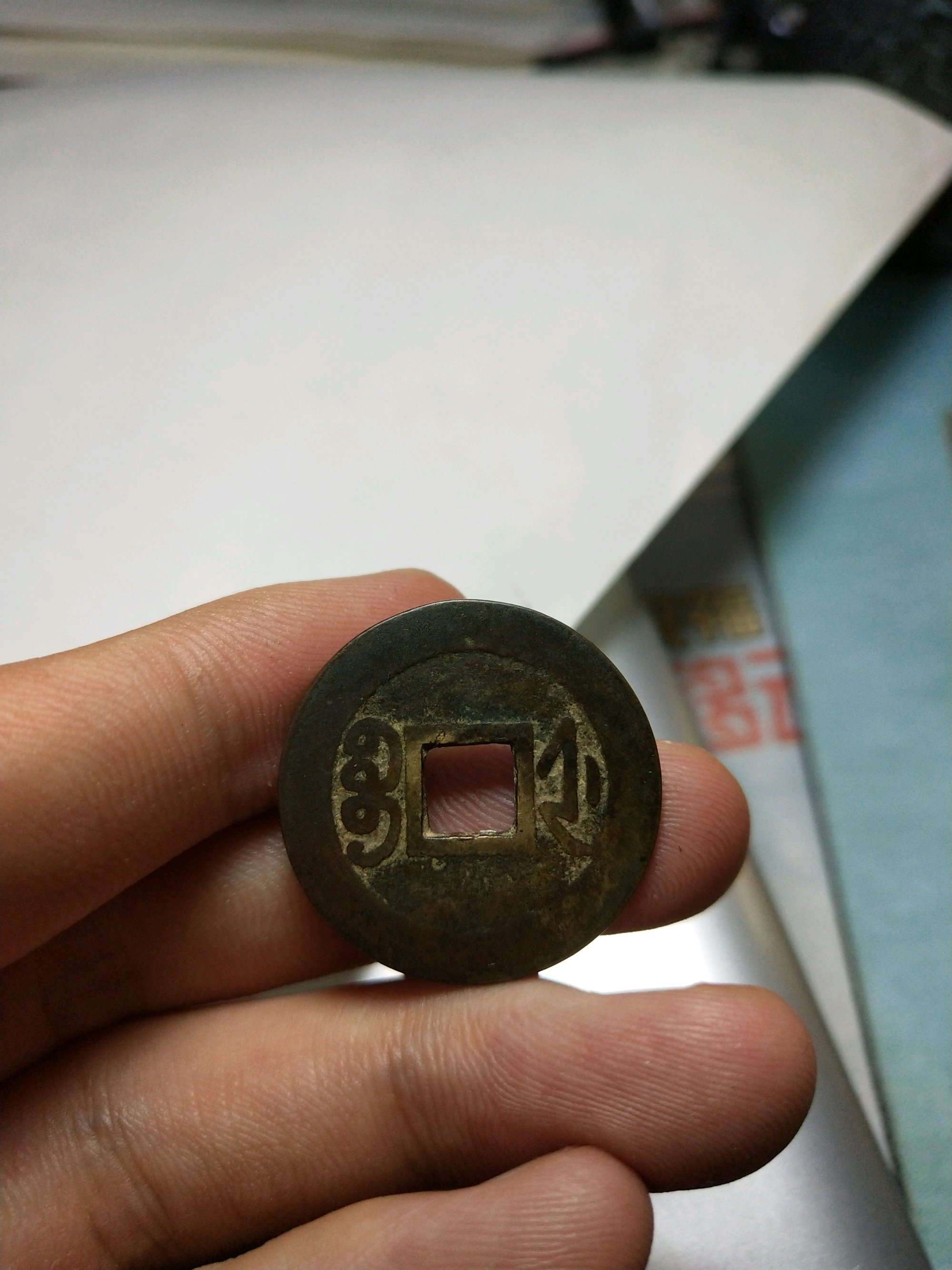 取下来背是卷尾宝。我手里还没有见过这种卷尾宝毛笔体的,这是啥好版不。直径25.2多,厚度超1.5,相当压手的一枚钱币