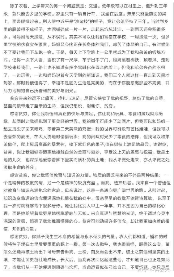 有知识没信仰,思想逐渐可怕,被迫向钱看,一切为了己,国不顾家则心不属国;感谢中透露着憎恨与羡慕以及幸运,反思中没有丝毫对制度的批判,为同样出生子弟的同情。成功感谢的不是困难,而是自身的坚毅和帮助过你的人,成为羡慕的人会让人幸福满足,但如果羡慕的是物质,那这种幸福就有可能堕落,满足会变得贪婪。但愿寒门女孩能够维持平常心,感恩常在。