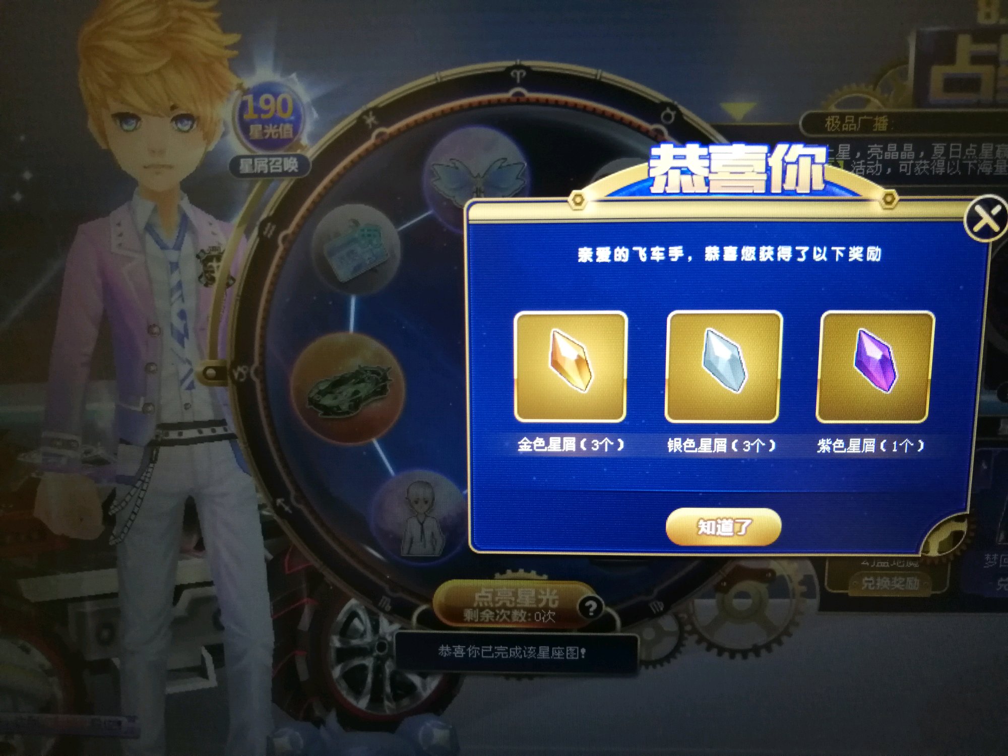 前几天一直一个一个金色星屑,今天190星光值3个金的,🌙座椅瞬间稳了