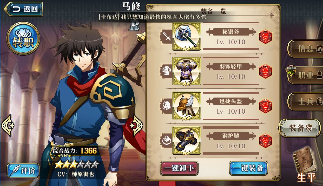 就这一个骑兵,感觉有点弱,上的怒涛,也不知道对不对,早上饰品给女王了改了时钟,缺饰品才能满附魔。