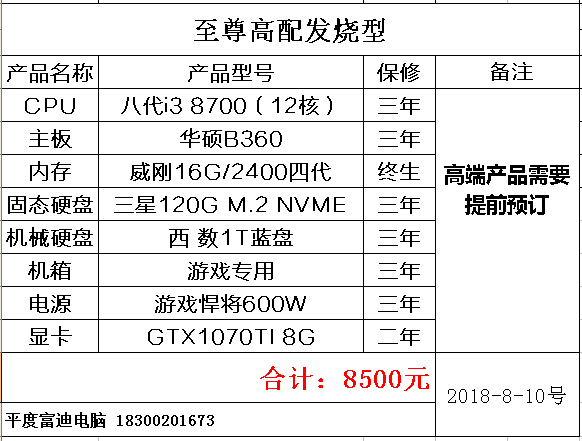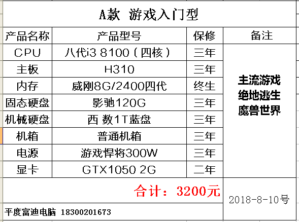 2018年8月份平度电脑配置价格单