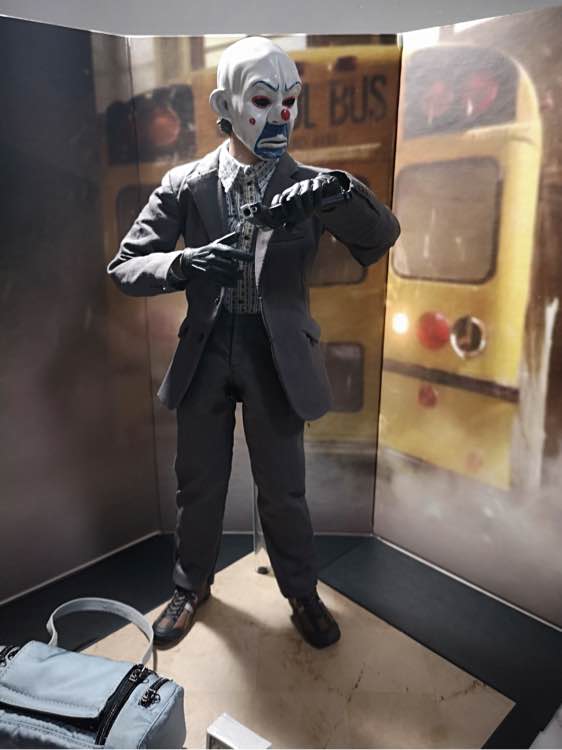 被枪指着的时候往右挪了两步,持枪的劫匪习惯性也走了两步,然后被校车精准撞死,小丑完美躲开。