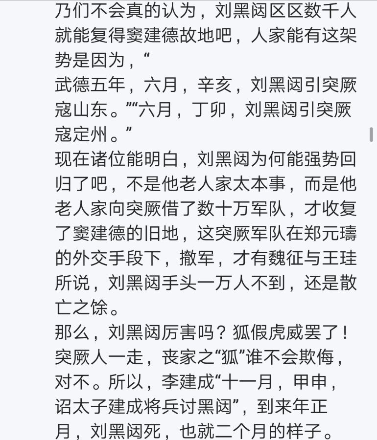 史料明明写的是,武德五年六月,颉利可汗带着十几万军队南下劫掠并州,抢走五千男女;刘黑闼则带着一万突厥骑兵打回了山东,俩人明显各干各的。结果到了这位小李粉吧主嘴里,变成了刘黑闼“向突厥借了数十万军队”。