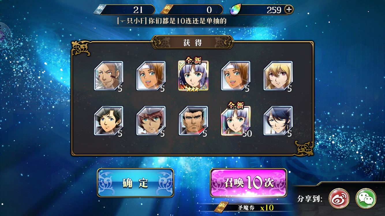 今天抽了2次10连出了这俩 可惜没有艾尔文 要不然光辉就差不