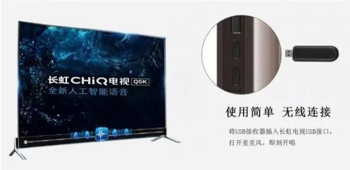 方式①遥控器操作:进入电视的应用栏,显示内置应用—全民K歌。Q5K电视的USB接口接入下图介绍的麦克风USB接口,实现无线话筒K歌。