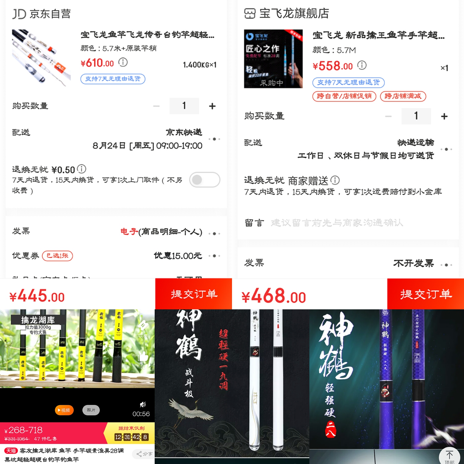 看了这么久鱼竿了,今天必须拿下一根,希望吧友给我推荐一根,为了方便看,我拼了图,右下角是本汀的不知道是不是大牌子,客友和宝龙飞听说不错?客友擒龙湖6.3的不知道重不重头重量在235g那样,其余几个牌子重量在210g差20g区别明显嘛?希望大佬指教!