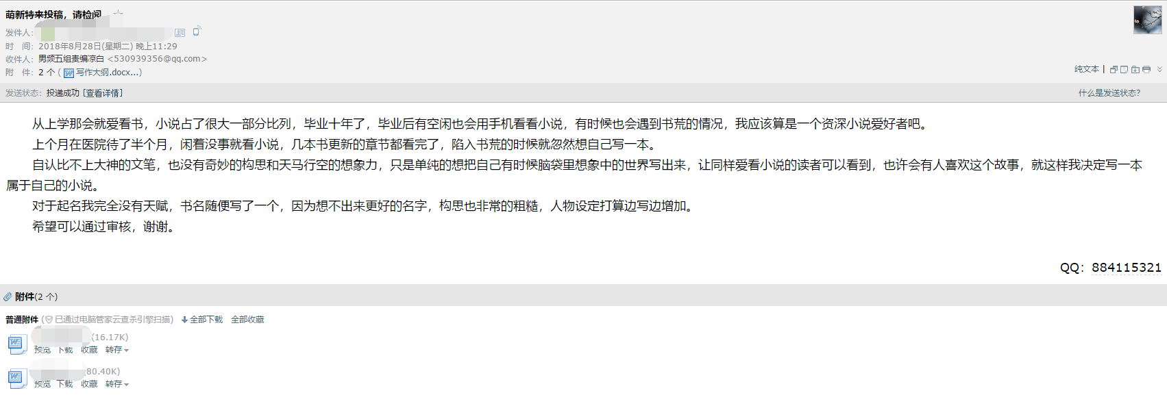 按照刚加入的阿里文学抱团群里的大神建议,我随便找了位网名看着顺眼的编辑投了稿,希望可以通过。