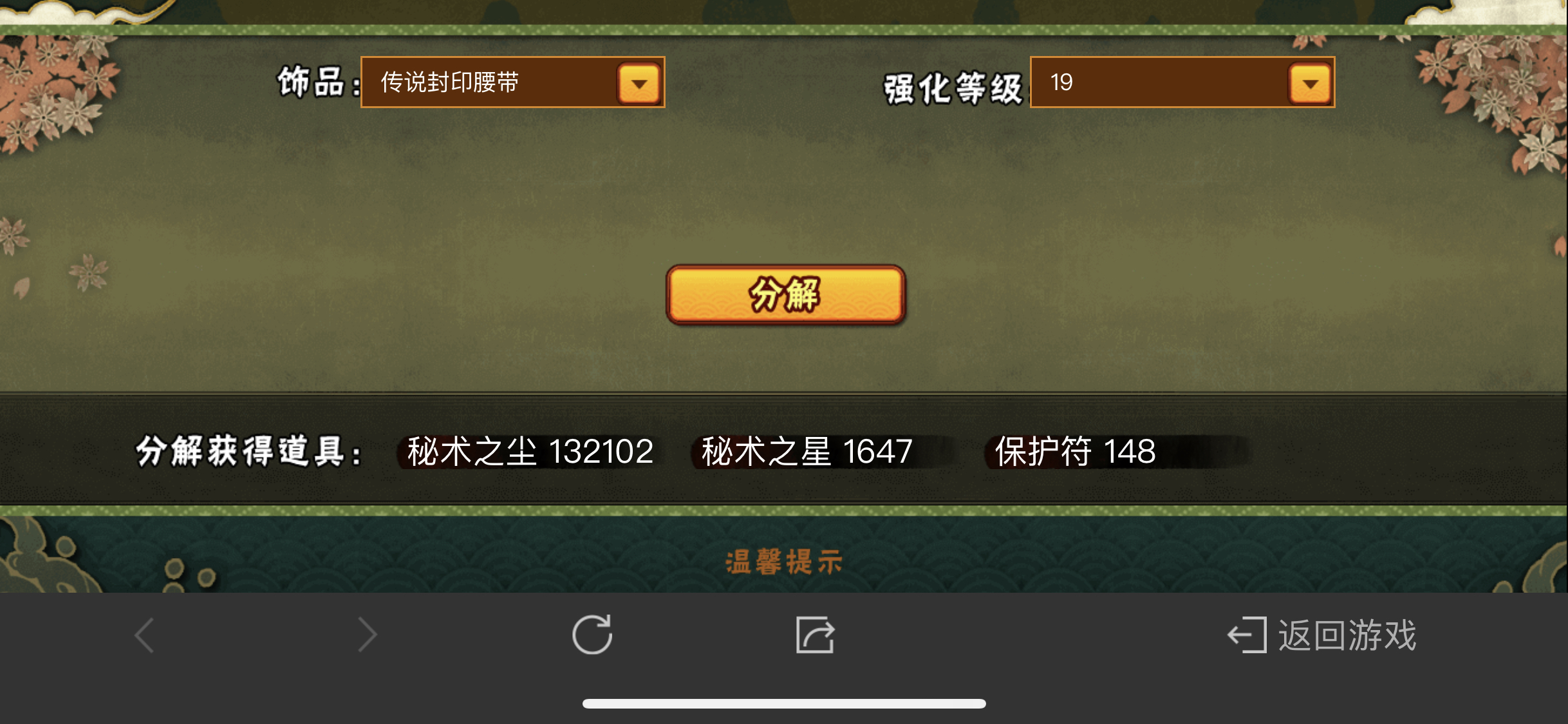 赚保护符不看后悔,关于饰品分解。封印18分解掉是不划算的,还不如直接用保护符点到19再分解,18分解是104张,19分解是148张,也就是说可以直接用保护符18强化到19花费40张然后进行分解,也就是说可以赚到4张保护符。当然从17点到19也是划算的,17到18要亏两张,18到19赚回四张,也就是说17到19只能赚两张。以下附图,有帮到各位的麻烦点👍哦 。
