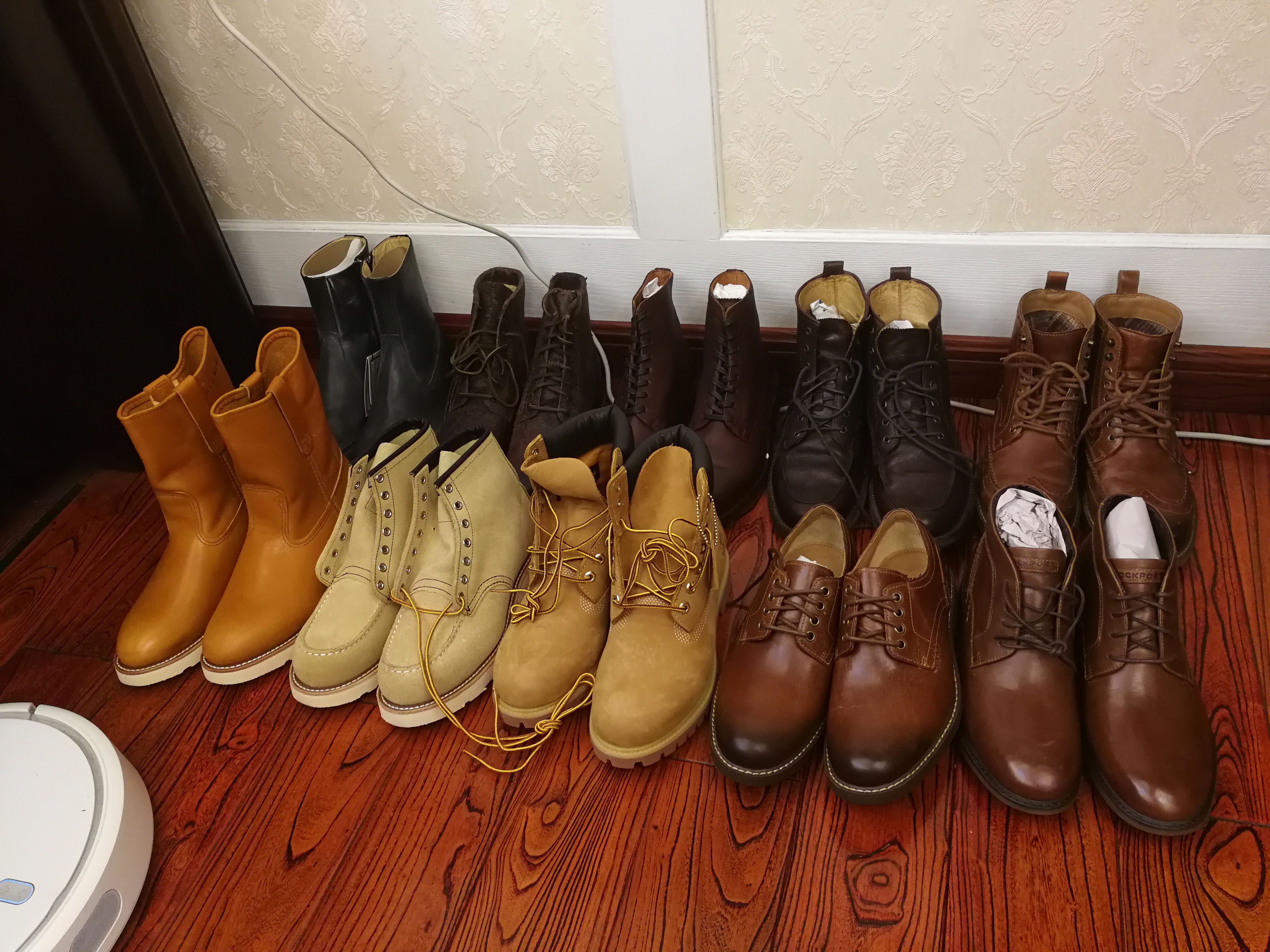 除了日常在穿的9111和转运在途的8103,放在单位的两双其乐、一双乐步以外,都在这里了。9866、8173、10061、Frye(后排从左到右james、tyler、seth、phillip)、其乐Hall和Lord、乐步collyns。