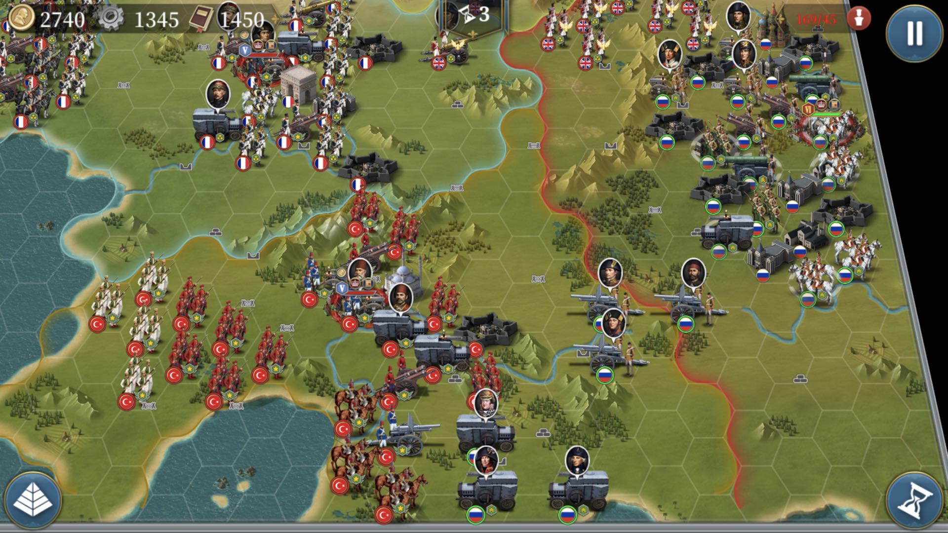 对面从第二回合开始,就会按照英国-法国-土耳其的顺序每隔几个回合出一波兵。你看上去地图的兵不是很多,没关系,对面联军会不停的无中生有。而你所需要做的就是,像塔防一样守住城市,同时还要抄了他们的老家