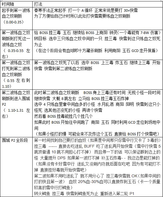 给BOSS兰催 钟林 商阳 玉石 钟林 兰催 商阳 (水月乱撒) 快雪*3 快雪*3 玉石 商阳 阳明 快雪到(练血之奴刷新的时候) 给BOSS上兰催 钟林 商阳 玉石 炸掉 继续给BOSS上钟林 商阳(此时利用商阳GCD走位规避血球) 因为大多数团都是聚怪打法 不管BOSS了 选中四只小怪中间随便哪只练血之奴 商阳(继续走位躲血球) 兰催 钟林 (如果还没聚拢等一下)等聚拢立马开始快雪快雪到这只小怪死为止 往没有血圈的地方聂云到一个可以打到BOSS的地方 给BOSS 兰催 钟林 商阳 炸玉石 钟林 兰催 商阳 读快雪读到第二波练血之奴出来 (我们是卡3波围城减少P3压力所以如果BOSS血量大于70%要停手)停手就不打了 等小怪出来以后停手2S 给BOSS兰催 钟林 商阳 炸玉石 然后直接转火比较靠中间血多的练血之奴水月乱撒 阳明商阳 快雪到这些小怪死为止 如果小怪死了BOSS还没跑回中间 给BOSS挂毒优先级 兰催》钟林》商阳 BOSS一旦开始往中间跑 商阳 玉石 通过商阳玉石的GCD跟随BOSS避开血圈走开中间 卡好下一个雪中行 如果第二波练血打的慢 那只给BOSS炸一个商阳也可以的 进入P2