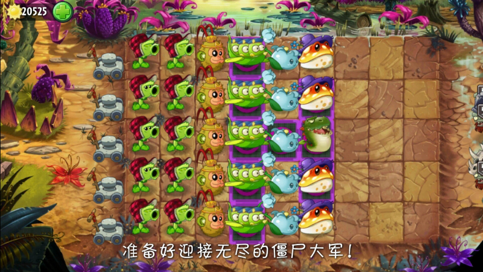 这是刚打完boss关。所以第一列的弹簧豆还没种