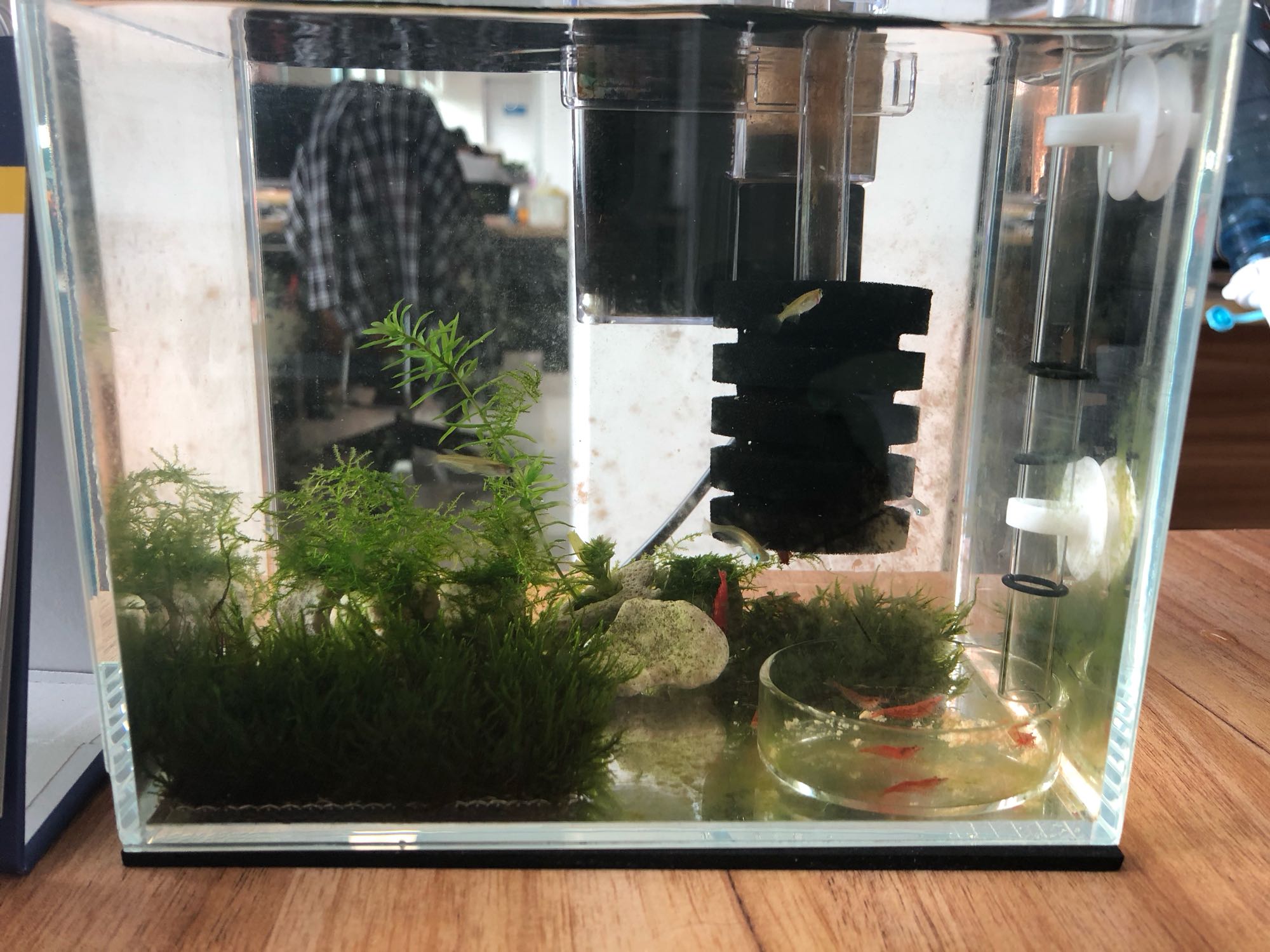 对了,感觉虾还是配青鱂鱼最好。我这个是公园捞的青鱂,小虫它们都吃掉了,现在虾吃东西翻出来的渣渣它们也会吃掉。嘴巴小,它们完全不吃虾
