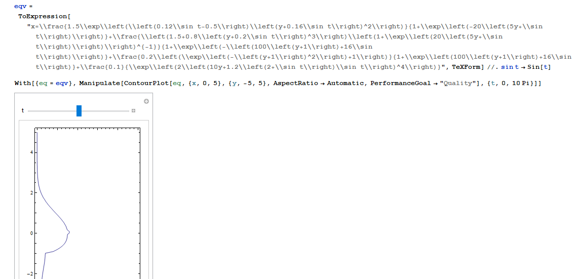 ,比较感兴趣的是第十个振动的实现,非振动状态下ContourPlot[ x==(1.5Exp[-.62(y-.16)^2])/(1+Exp[-20(5y-1)])+((1.5+.8(y-.2)^3)(1+Exp[20(5y-1)])^-1)/(1+Exp[-(100(y+1)-16)])+(.2(Exp[-(y+1)^2]+1))/(1+Exp[100(y-1)-16])+.1/Exp[2(10y-1.2)^4],{x,0,2},{y,-3,3},PlotPoints->50,AspectRatio->Automatic],嗯,振动状态下是Manipulate[ContourPlot[ {x=(1.5Exp[(.12Sin[t]-.5)(y填空)])/(1+Exp[-2015y+填空]),x==0.1E^(-20000 (.12+y)^4)+(1.5E^(-.62 (-.16+y)^2))/(1+E^(20-100 y))+(.2 (1+E^-(1+y)^2))/(1+E^(-116+100 y))+(1.5 +.8(-.2+y)^3)/((1+E^(-84-100 y)) (1+E^(-20+100 y)))},{x,0,20},{y,-3,3},(*PlotPoints\[Rule]50,*)AspectRatio->Automatic],{t,0,3.14}],比较**的是x=f(t)的形式视频中没有完整给出,尝试猜了些形式也没实现。那么问题来了,哪位老哥老姐可以找到完整的函数,或者完成上面的填空呢?