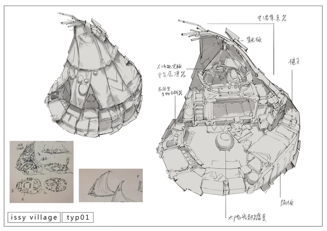 舉例來說,以下是電影場景中會出現的聚落設計圖,首先這個場景必須與電影預設的時間背景一致, 2179 年,人類可以開始進行超越光速旅行的未來世界,可想而知,無論是要設定都市或郊區,一定要帶有與 21 世紀有距離的科技感,而這個場景的重點:由少數族群落腳的聚落,又必須具備這樣族群可能有的離群索居特性,大樓必定不會是這個聚落的樣貌,那又要如何呈現未來流浪者的居住地?這句話在創作團隊的腦中發酵,繪師用一筆一畫疊加出由很多次的討論得出的這張設定圖。