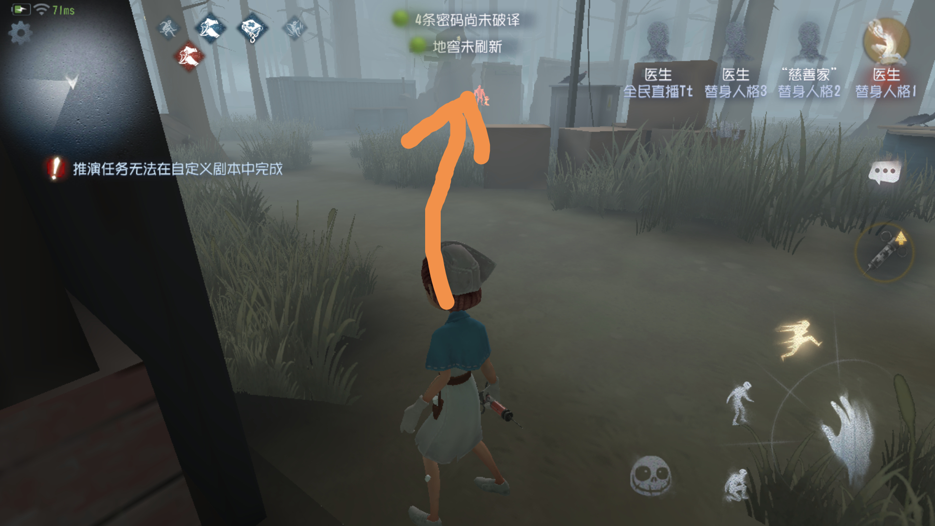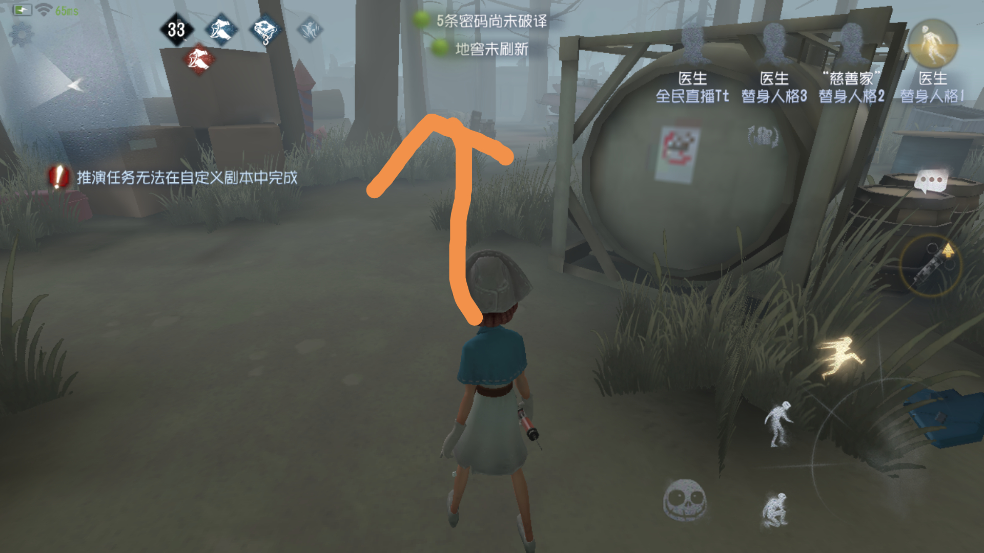 沿着黄线跑进窗 直接到大门废墟与屠夫绕个三四台电机