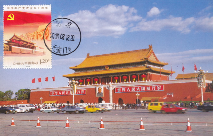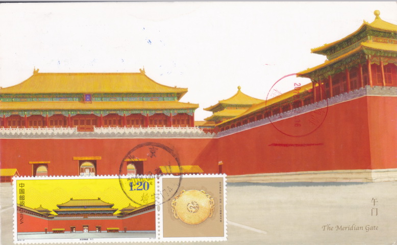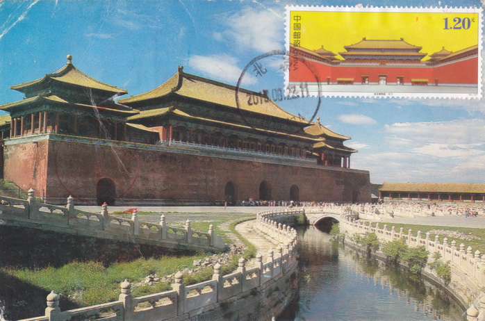 我这样也算是抢救了那张片,那张片被我在一堆片里发现的时候,右上角有贴了邮票再撕下来的痕迹,看痕迹尺寸很像特15首都名胜。我买下来,在同样位置贴了午门邮票。如果能够实地盖戳,效果会好很多,不过实在是没有办法出的下策了。