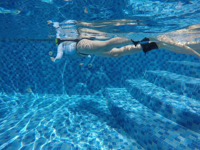 3.身体的姿势保持流线型,平行于水面,游动过程中膝盖和脚踝绷直平行,大腿和臀部发力,找摆动的感觉,幅度可以大点,频率不要太快