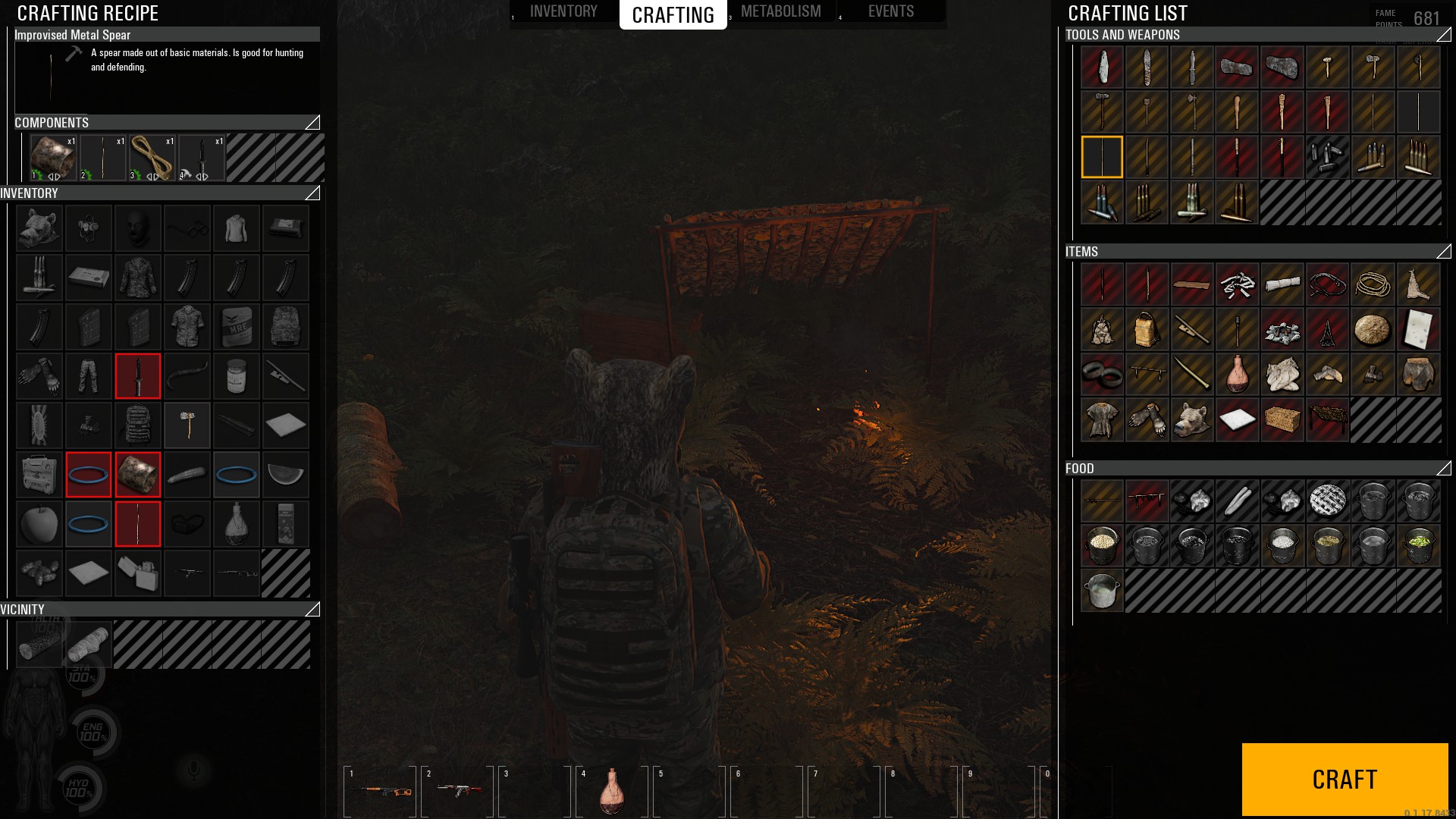 我们把三根都带在身上,进入制作页面,可以看到,这时候铁制长矛是可以制作的,系统自动带我们选择了其中一根电线。(绳子和电线是互相可替代材料,截图的时候忘了点,所以上方需要制作材料那里显示的是绳子,不影响实验,见谅)