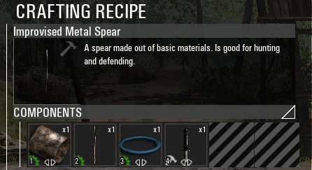 我们以制作一个铁制长矛为例子,制作页面可以看见铁制长矛需要的材料为:一块废铁,一根长棍,一根一米的电线即蓝色圈圈,一把小刀。
