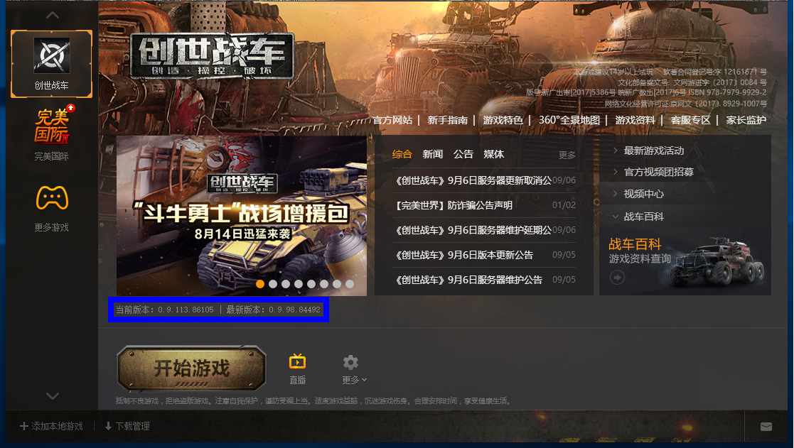 完美游戏平台右键点击创世战车⋙打开游戏目录⋙打开version.txt文本文档⋙把此版本号改为最新版本号保存⋙开始游戏