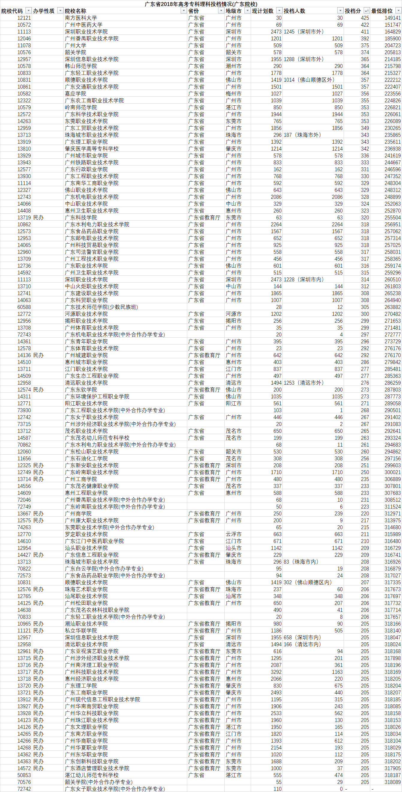 2018年广东高考理科专科分数线