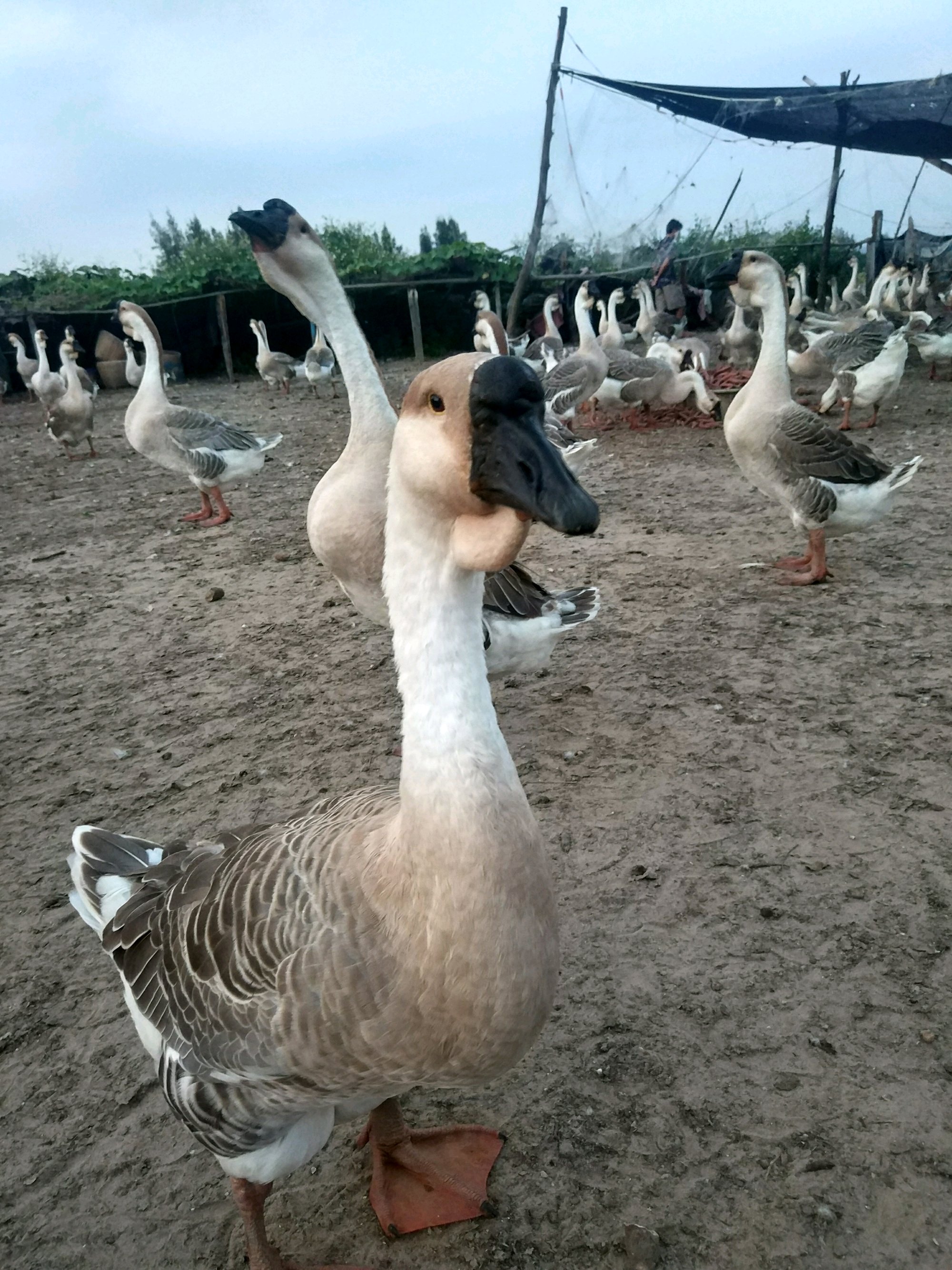 鹅分两种,一种是白鹅,一种是灰鹅。他这种鹅是广东灰鹅里的狮头鹅,体型硕大!