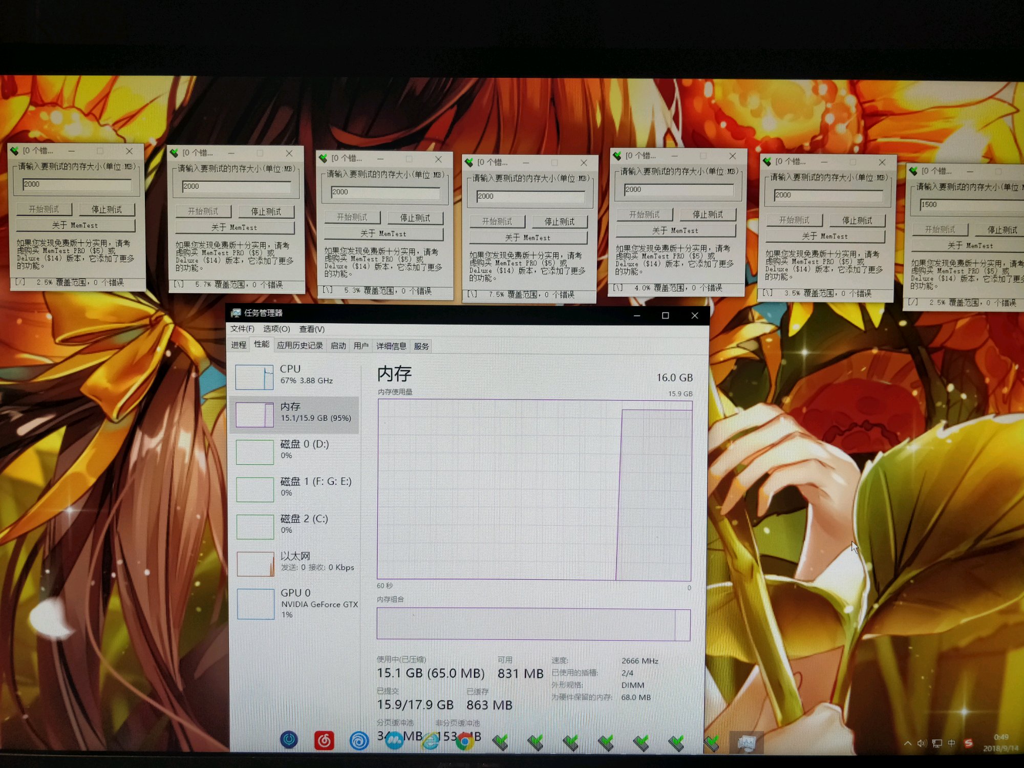 最后就是memtesr的测试,也不知道什么原因,软件提示多来几个副本,每个2000mb进行测试,测试了大概20分钟(最后一张图)其中有一个出现了两个错误,别的都是正常的,应该没什么问题了……