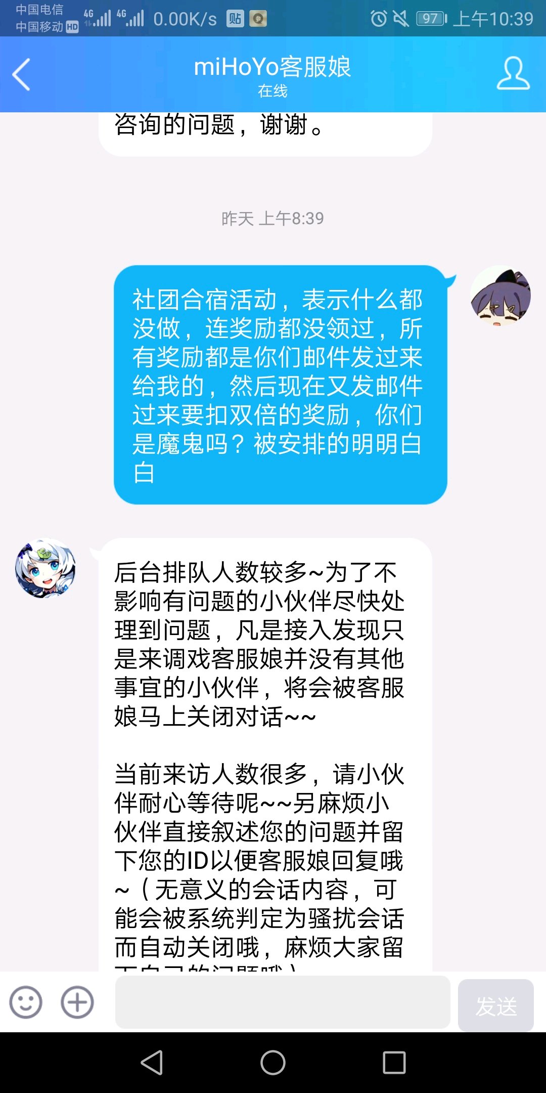 关于社团合宿活动,说实话什么都没做,关卡都没打完,连奖励都没领过。所有活动奖励都是活动结束邮件发过来给我的,然后现在又发邮件过来要扣双倍的奖励。你们是魔鬼吗?现在找客服不理,贴吧发帖又挨删,被安排的明明白白!!