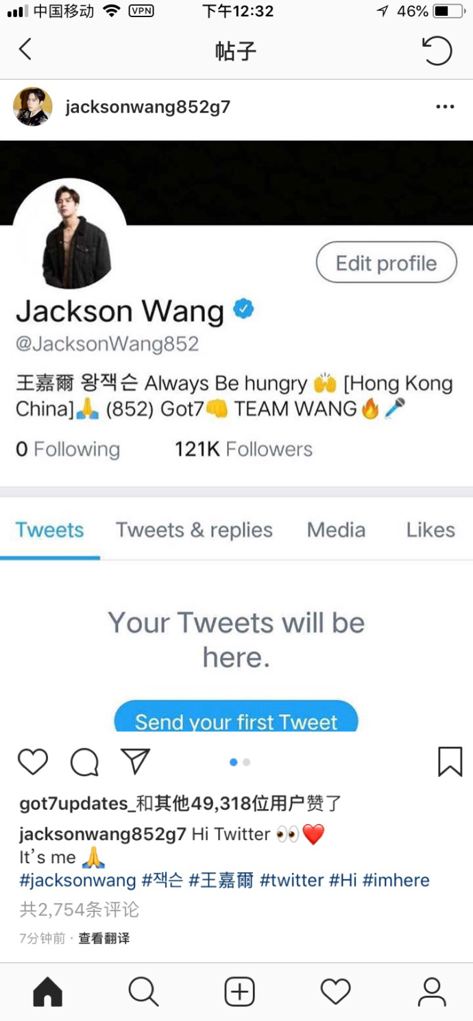TAG👉jacksonwang+잭슨+王嘉爾+twitter+Hi+imhere
