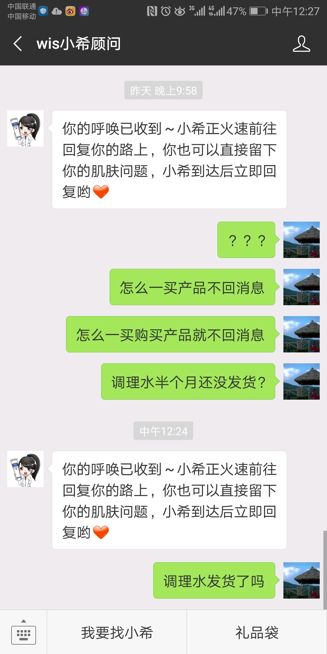 给我个解释,之前没付款随时都在已付款就不搭理我,然后货到了要不是我去问都不知道少了东西,然后跟我说缺货,压仓,感冒什么一堆乱七八糟的拖了半个月,后来去问一些问题也是不回我,然后我用小号去加,秒回???