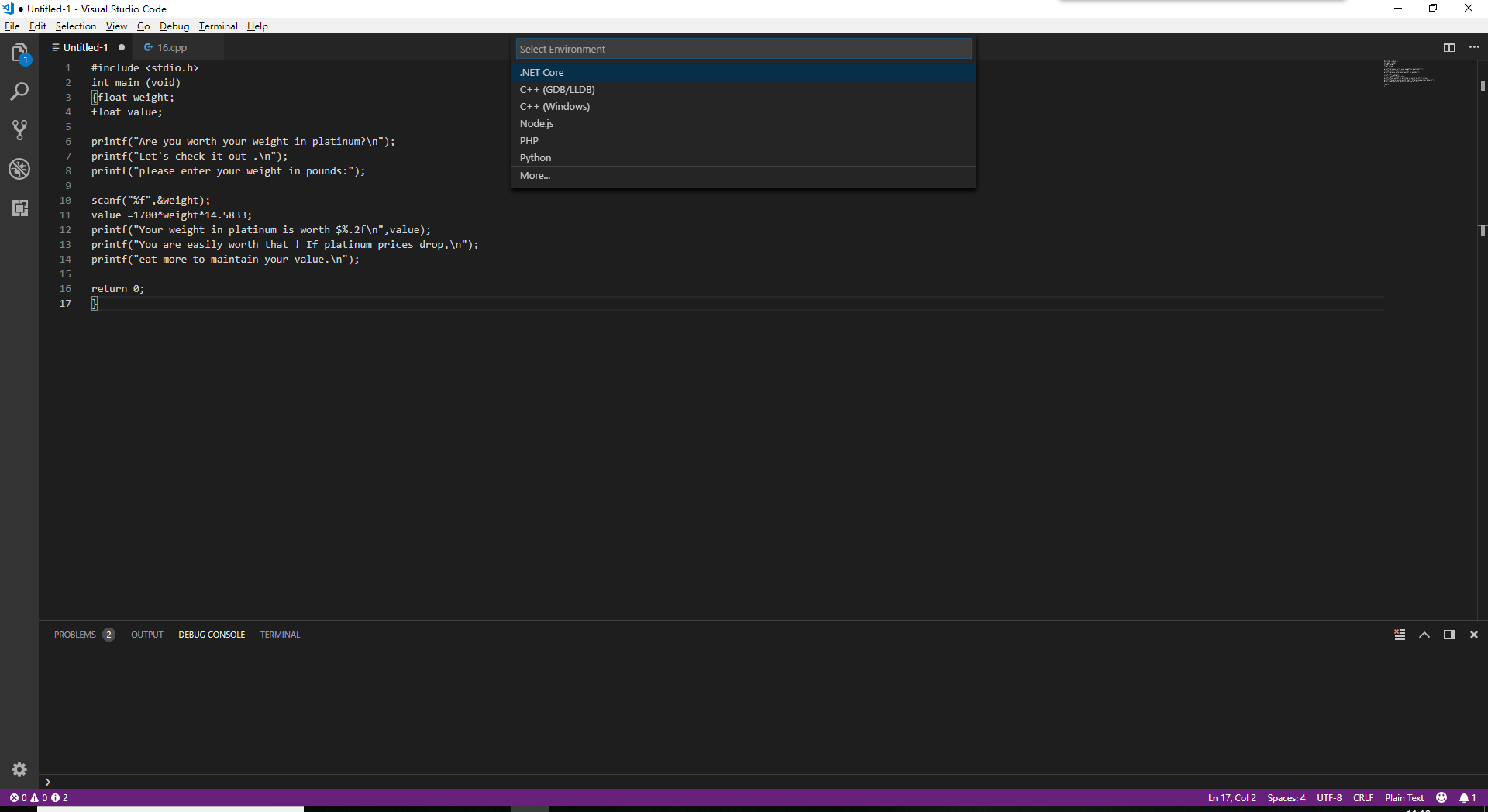 RT,写好之后点击starting debug 然后让选择环境select environment,然后选择了c++就没后续了…………