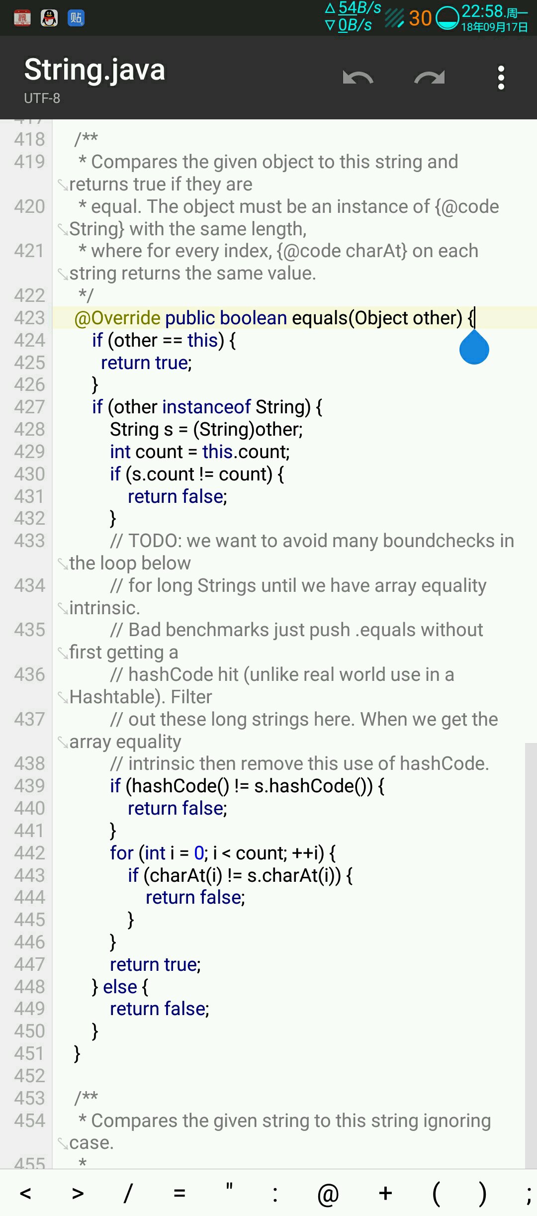 你看图,方法里先判断是否是同一类,然后判断长度是否相等,再然后是hash,接下来就是循环一个一个比对char是否相等了。