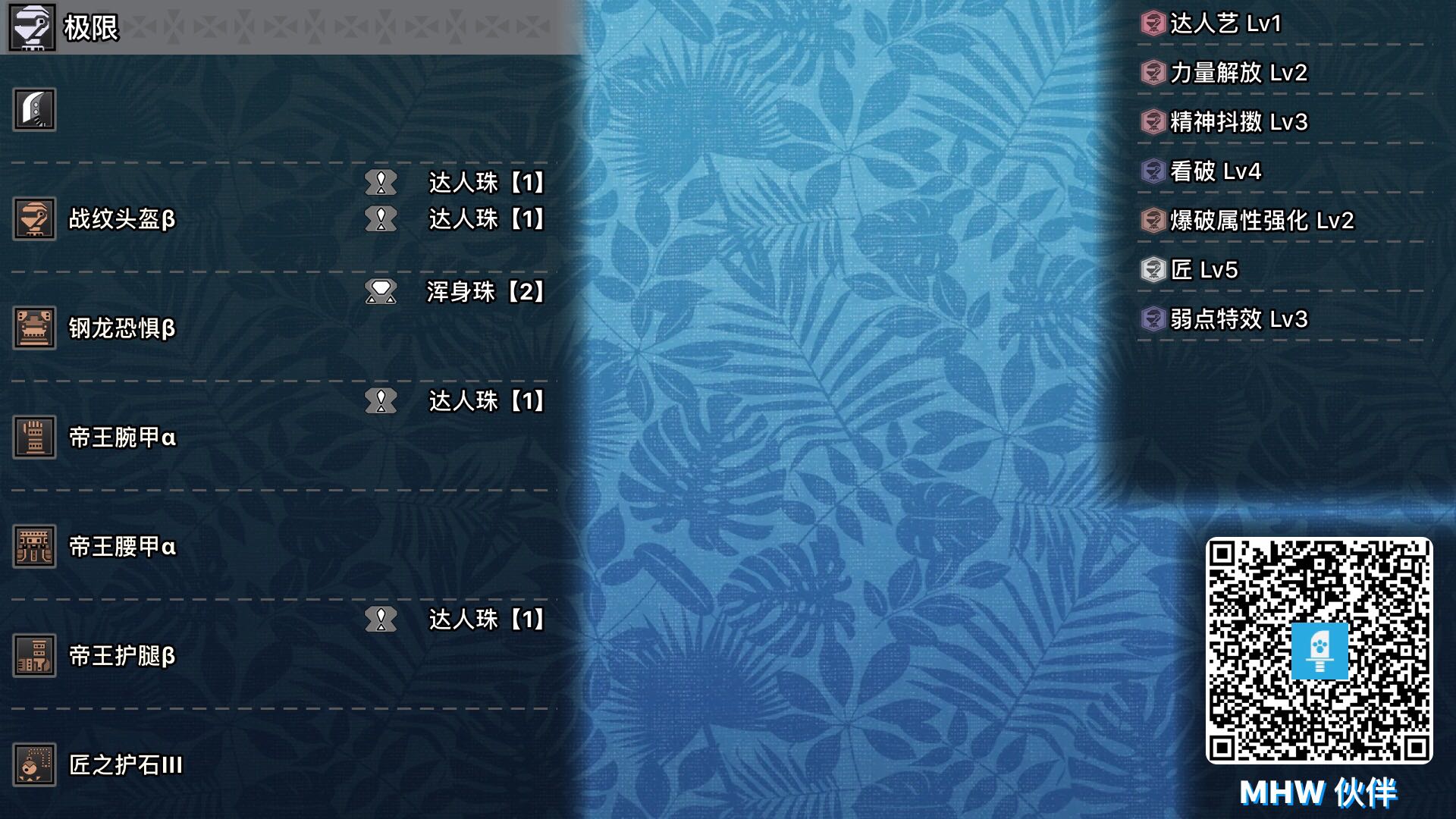 战纹头,帝王bab,死神腿,匠护石,7看破珠子,1无击珠子。百爆无击达人艺