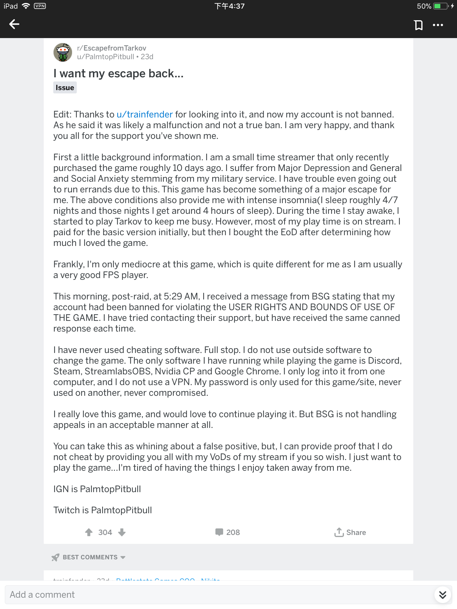 我的理解是Nikita帮他恢复的,虽然Nikita没有明说。因为如果像Nikita讲的那样仅仅是系统错误,在后台并没有被真实的ban掉,那没办法解释他为啥会收到BSG的封禁邮件和论坛权限被ban。