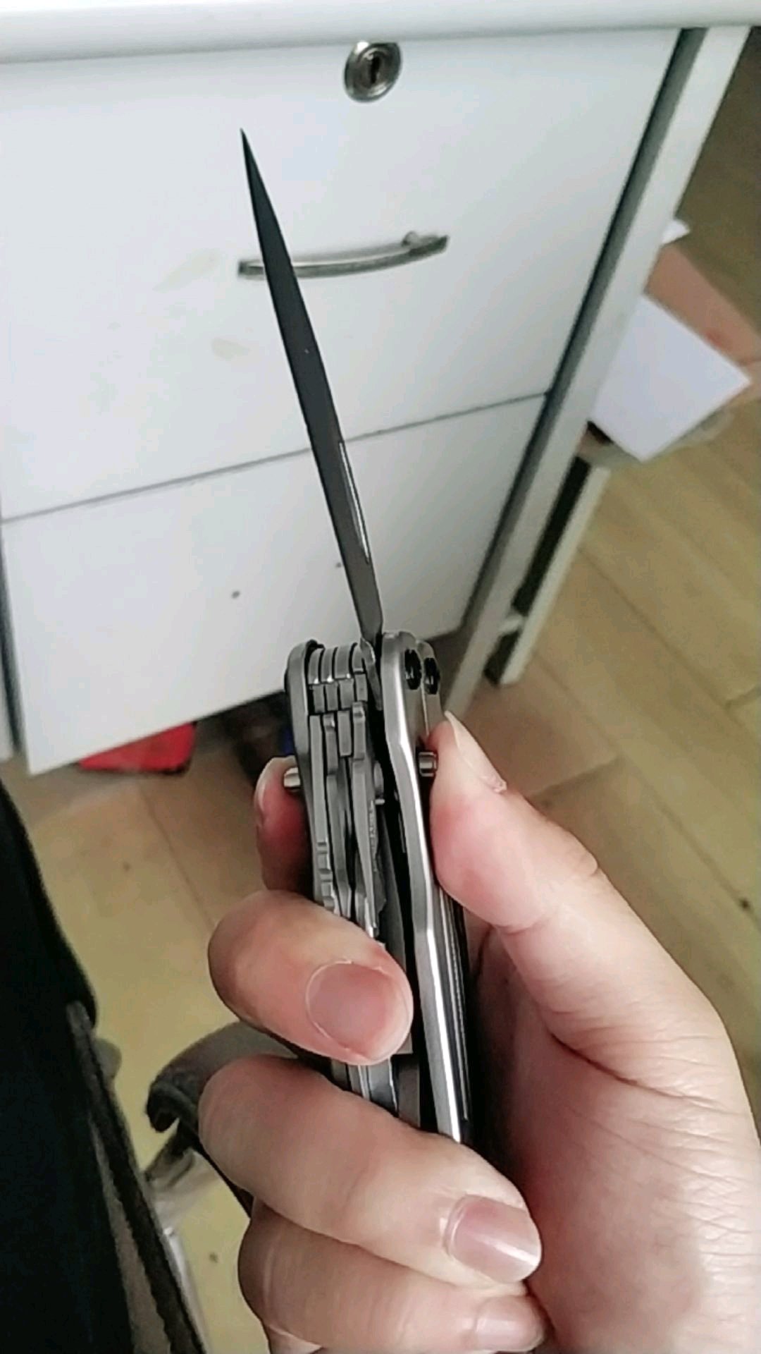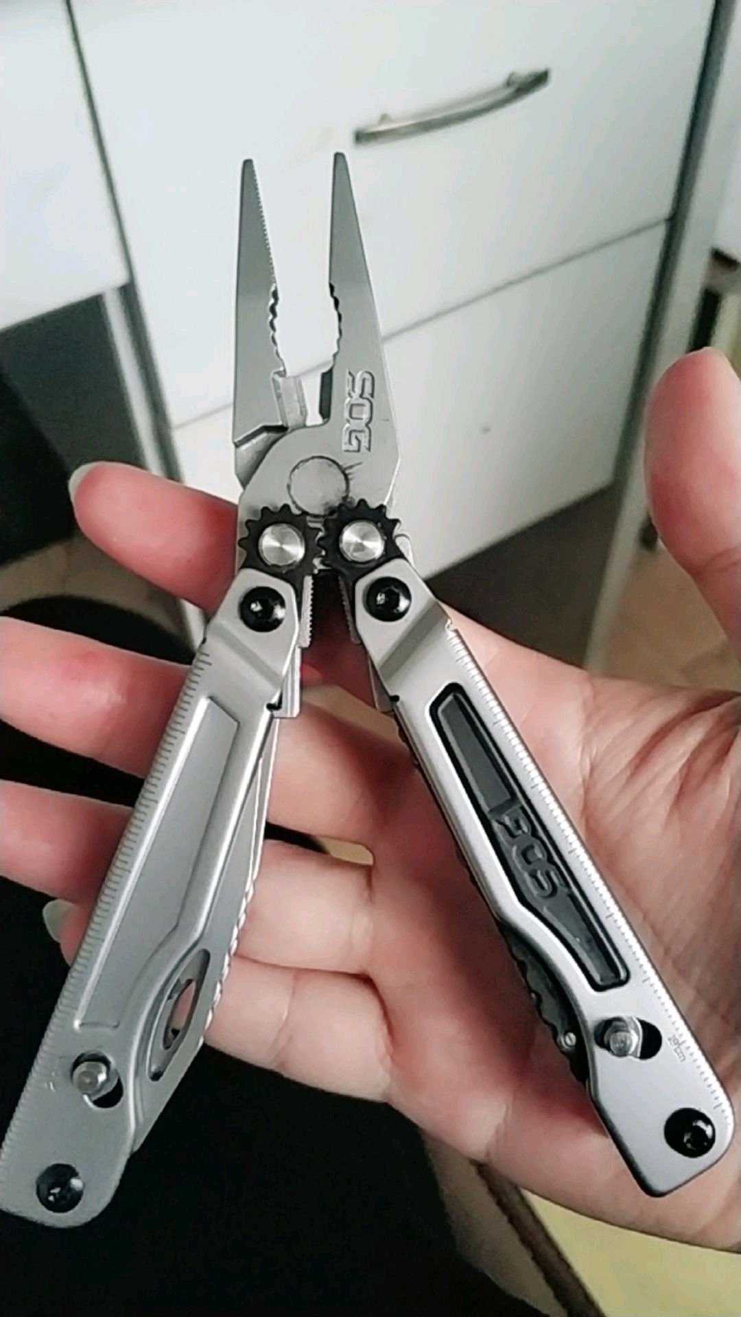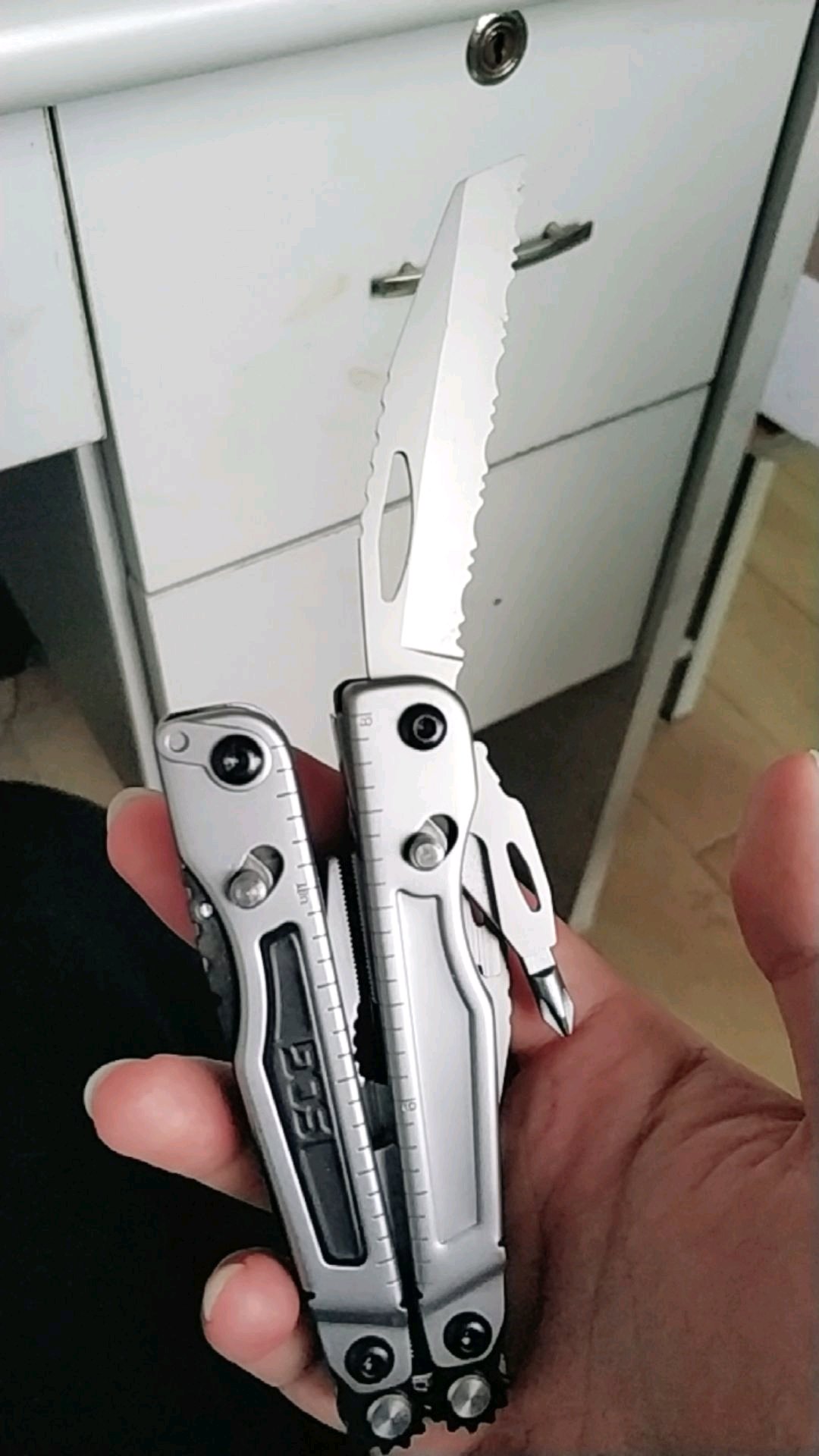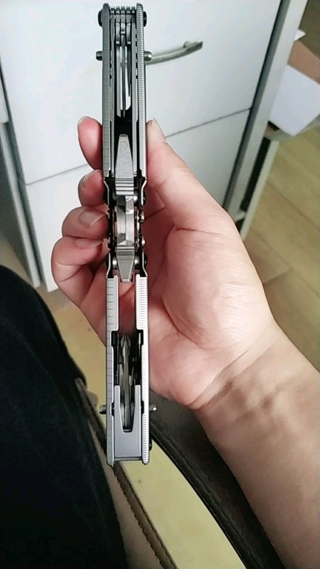 把玩了一下,不如b67顺畅无法单手甩出钳子,也无法收钳。不知道多用用会不会好,有阻塞感。和官方视频不一样啊。还有就是主刀快开,根本不行啊扣那个刀背的洞很紧。然后同侧小工具容易一起跑出来,好不舒服。虽然工具多,但是重复的也多,感觉送的螺丝批不用随身带,的确k鞘就够了也漂亮。又说回两把快开带锁的刀,收刀更麻烦,那个解锁要两个手指搬,很难到位,感觉做工真的不行。哎虽然实惠点,不知真假大侠们给看下哈