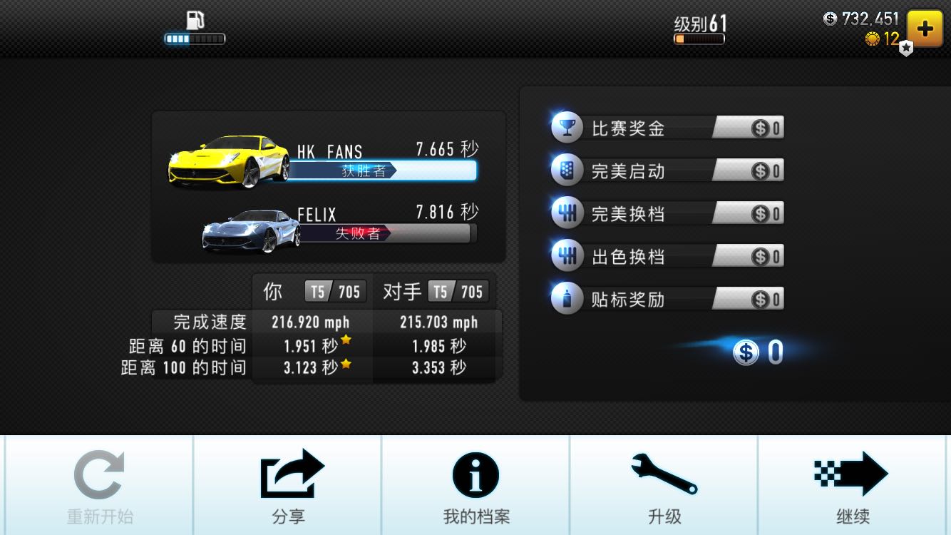F12,我的跑法是全P,5档初放氮,成绩:7.805