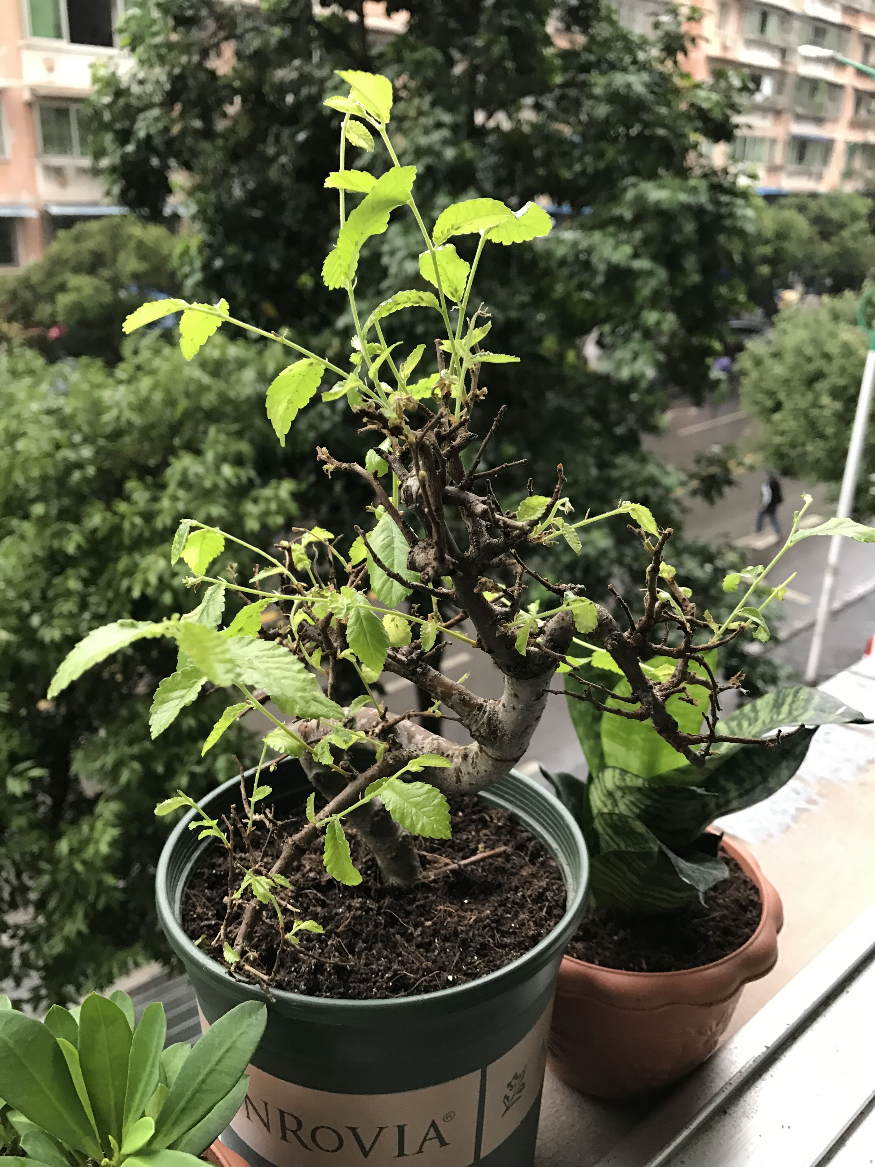 网购小榆树,一直放办公室养的,没怎么晒太阳,之前老叶子全部掉光了,前段时间发了很多新叶子,但是最近发现盆周围有颗粒油状物,部分叶子也发黄萎缩,剪的时候发现叶子摸着油乎乎的? 不知道是怎么回事? 今天下雨,拿到同事办公室的窗台上摆着拍的照片