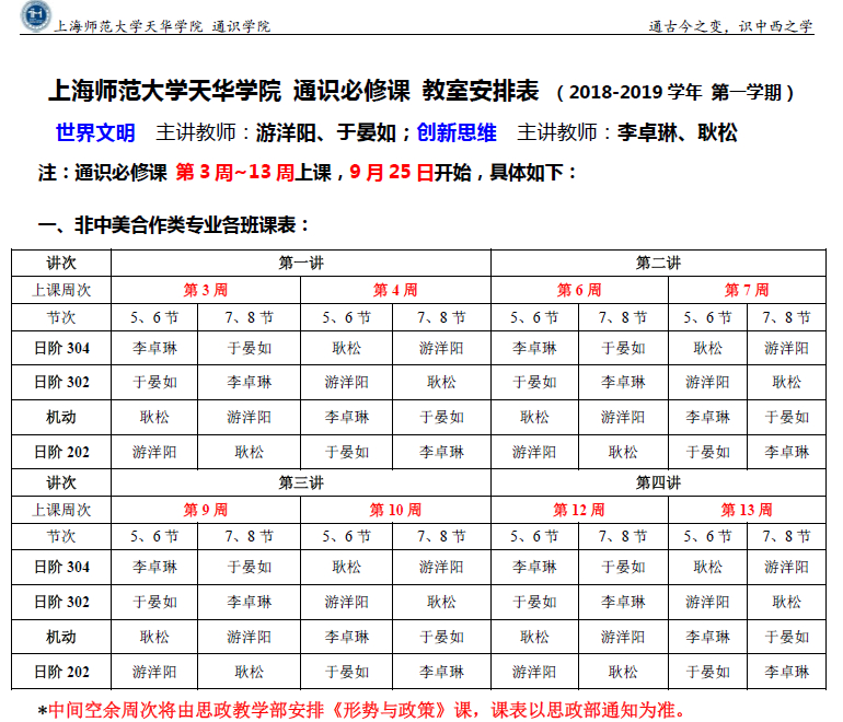 本学期2018级通识核心课程《世界文明》《创新思维》将于下周二(9月25日)开始面向2000余名新生同学上课!(因中秋假期,周一24日上课的班级,调到29日周六下午上课)