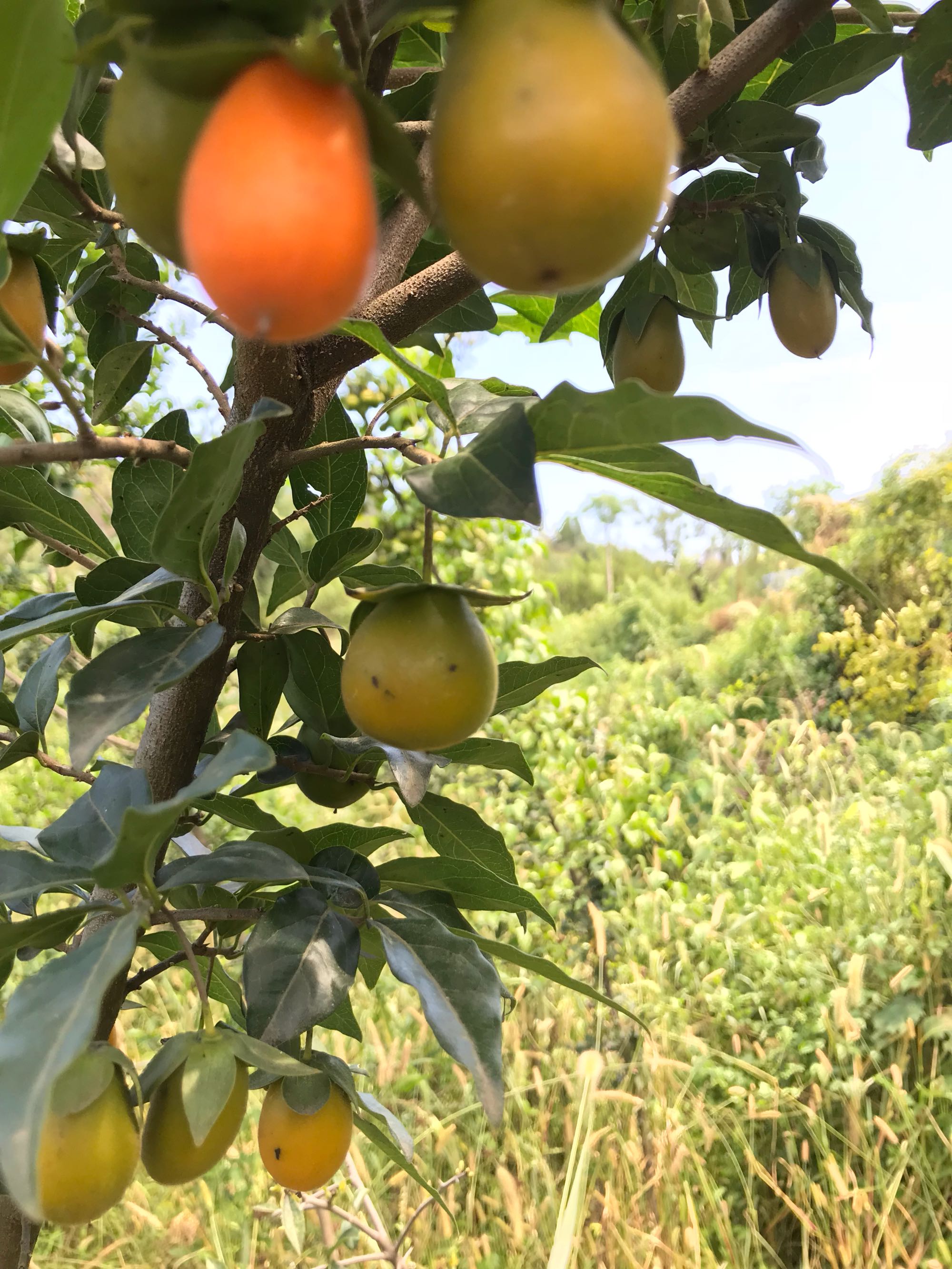 靓果多多咉山窝,何须爬山坡。信手顺来红黄果,我自怀中裹。