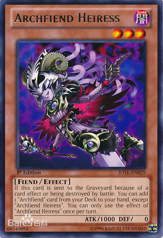 OCG日文名:ヘル·エンプレス·デーモン英文名:Archfiend Empress卡片密码:31766317卡片种类:效果怪兽使用限制:无限制星级:8属性:暗种族:恶魔攻击:2900防御:2100罕见度:面闪SR,金字UR卡包:STBL(702),EXP04效果:这张卡以外的场上表侧表示存在的恶魔族·暗属性怪兽1只被破坏的场合,可以作为代替把自己墓地存在的1只恶魔族·暗属性怪兽从游戏中除外。此外,场上存在的这张卡被破坏送去墓地时,可以选择「地狱女帝恶魔」以外的自己墓地存在的1只恶魔族·暗属性·6星以上的怪兽特殊召唤。 [1]