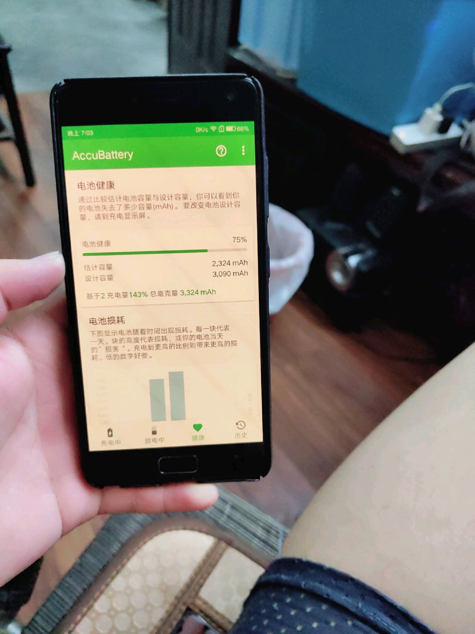下班了,换电池前先给之前的测试了一下,损失了四分之一的电量!