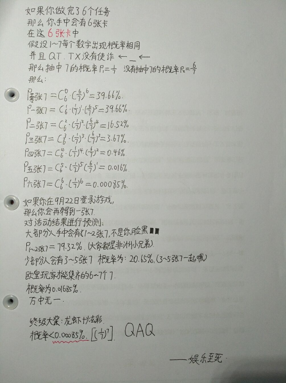 一位算数鬼才老哥给出的概率 不得不说策划还真是特🐴的在自挖坟墓 活动一开始给的让人感觉很好 其实B数都在特🐴的()里