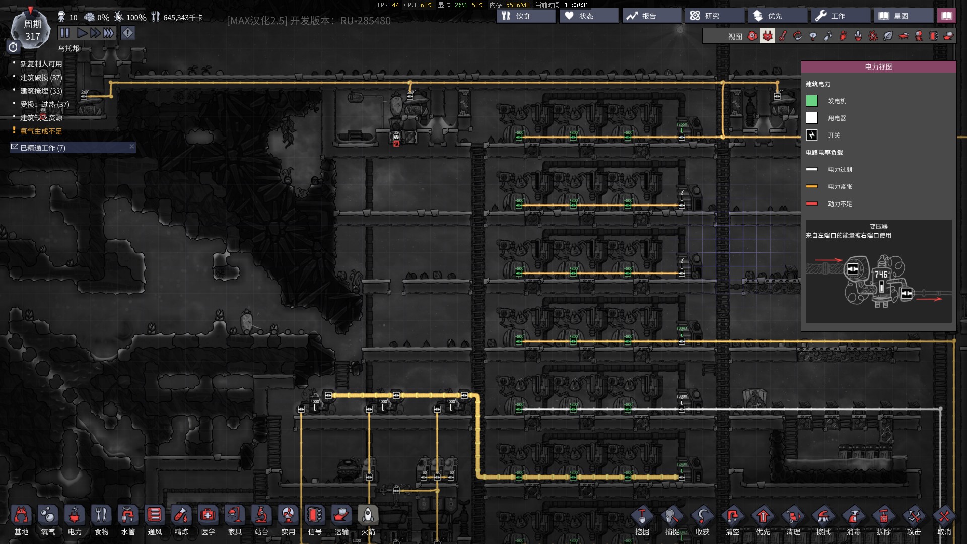 还有就是就用电量,炼金属,液冷机,炼油机,火箭竖架,各地抽水,都是天然气,前期当然不能用太猛,天然气可能跟不上,但中期随意,后期打脸。看我另一个800周期的档,一格2273千克的天然气,怎么用得完?